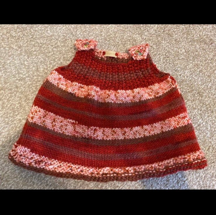 Unique hand knitted baby dress made from acrylic yarn. To fit approx 1-5 months. Dress for younger babies that can then be worn as a top as baby gets older. Baby pictured is 3 months.