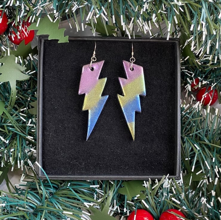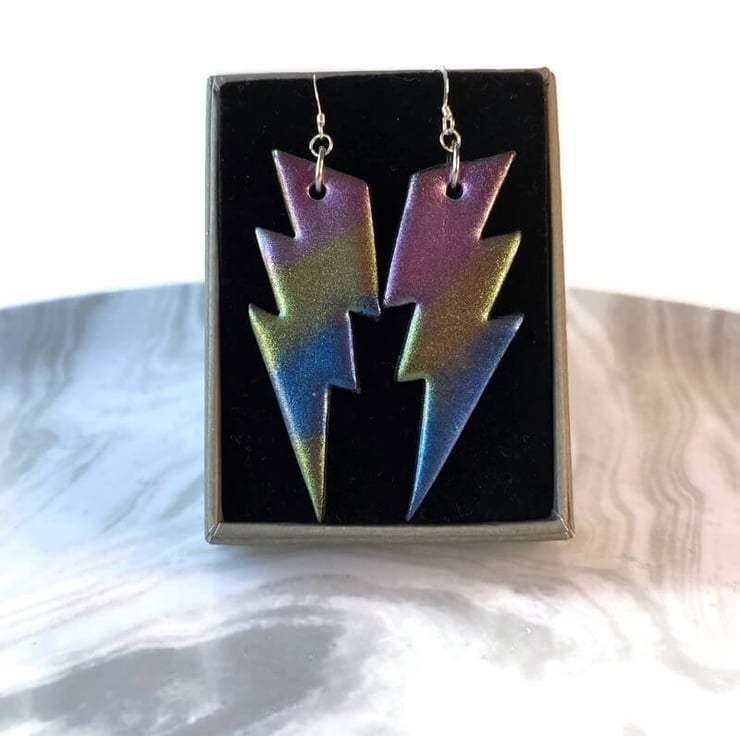 Lightning bolt metallic shimmer dangle earrings on sterling silver ear wires. Handmade with polymer clay and shimmery mica powders lightning bolt shaped earrings.