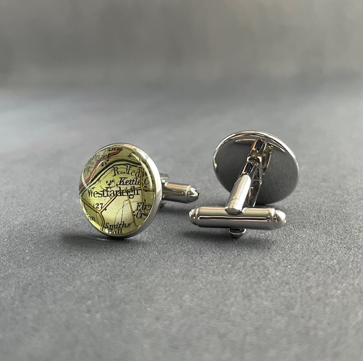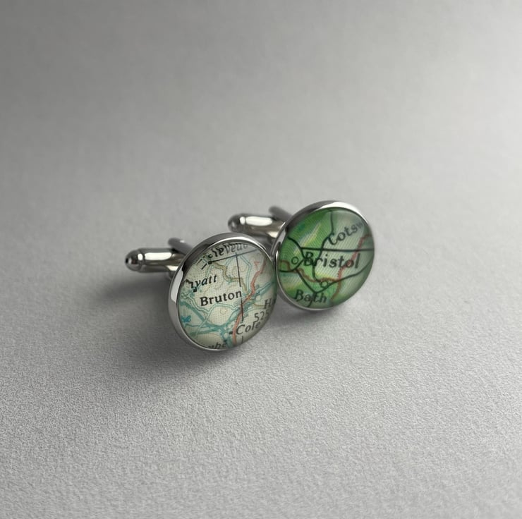 A pair of personalised map cufflinks, created using real pages of maps, each one showing a placename that you have specified. A unique bronze anniversary gift for your spouse, or a special gift for any occasion. I use vintage paper maps to create these unusual and charming cufflinks.