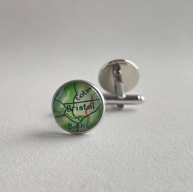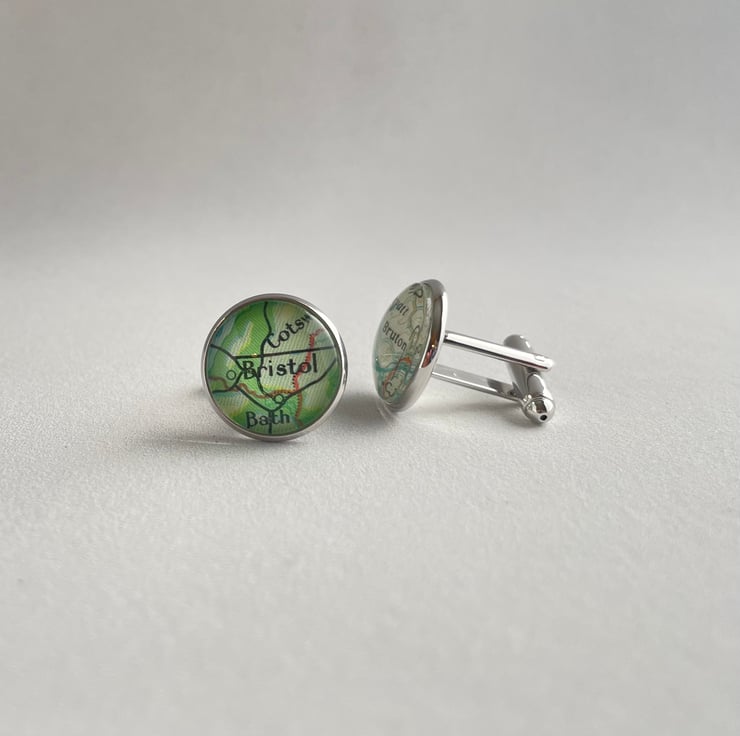 I use vintage maps for all my cufflinks, and each map is carefully sealed behind a glass lens using a special refractive adhesive. The cufflinks settings themselves are bronze plated.