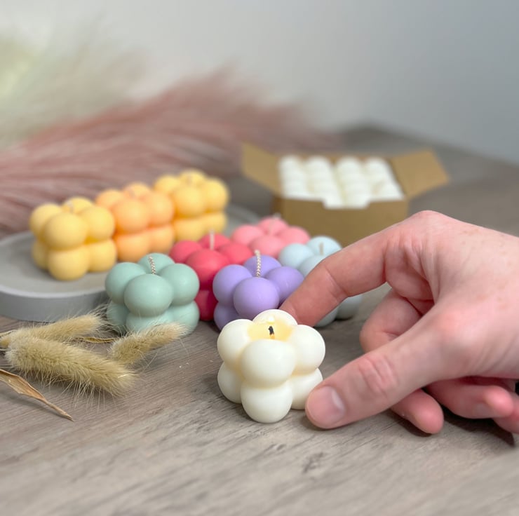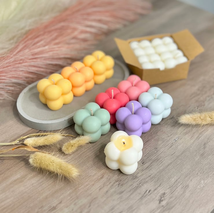 Mini bubble design candles in a cubic shape, each small bubble candle is made up of four circular cubes. These aesthetic soy wax candles make modern and minimalistic decorations for your home and will add a perfect pastel colour pop to any small space in your home. These candles are ideal for small tables and shelves.