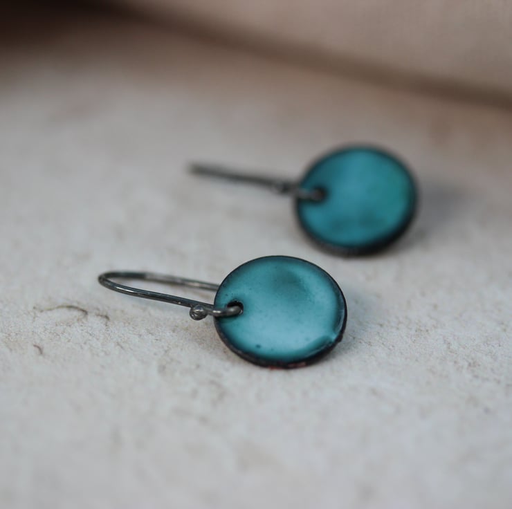 These small circle earrings are copper with glass powder enamel applied and then fired in a kiln to create a glossy surface.
