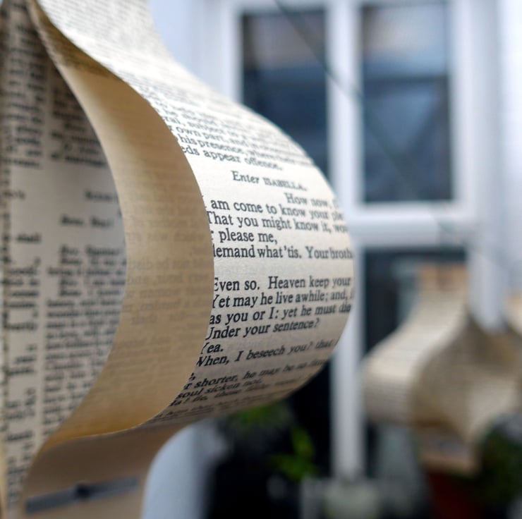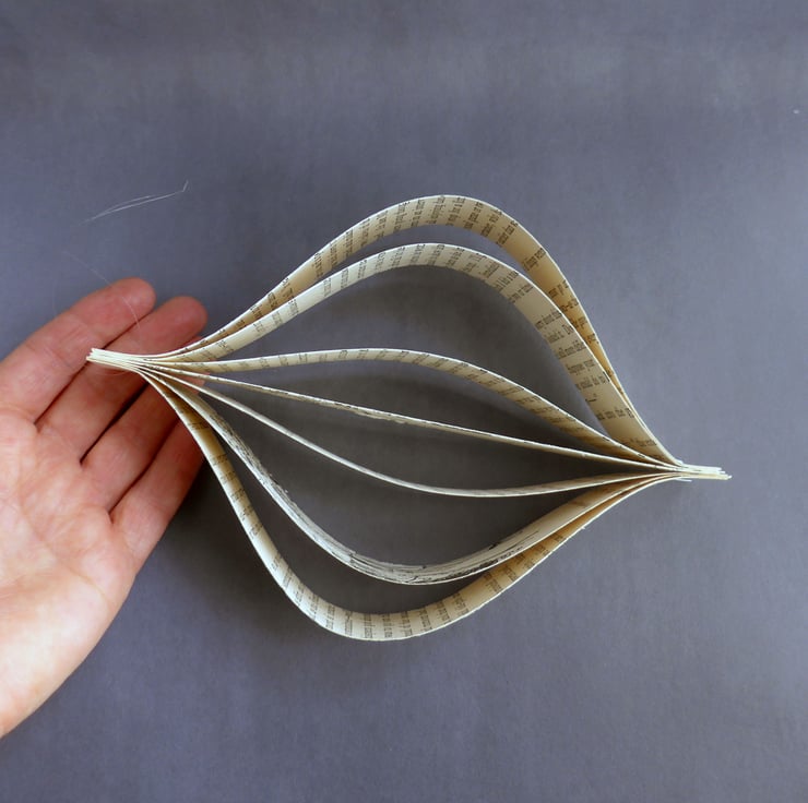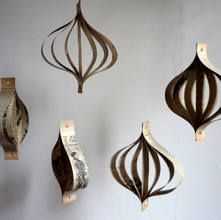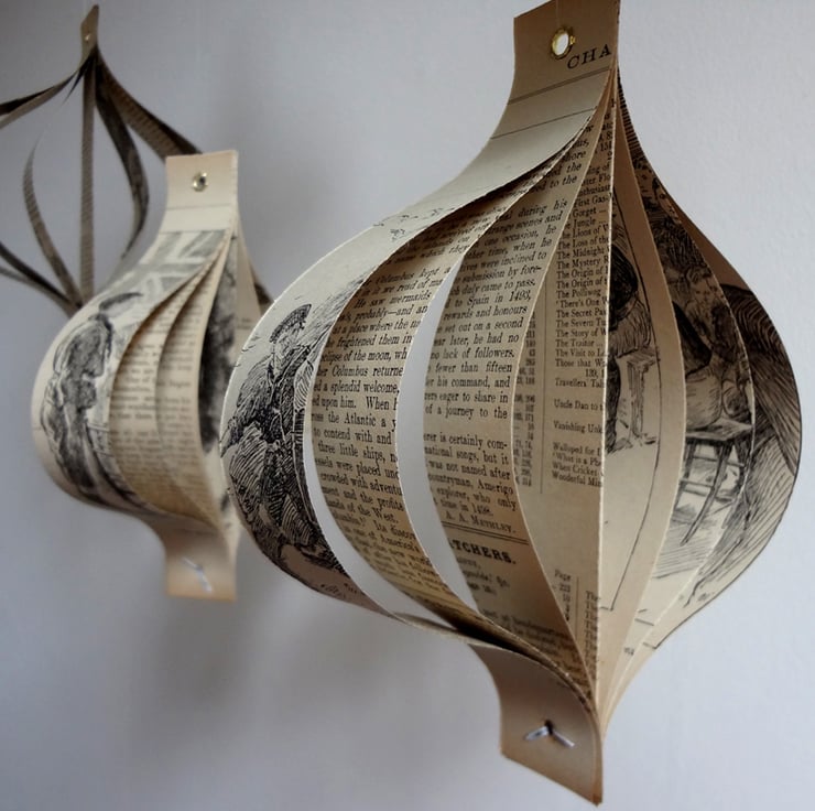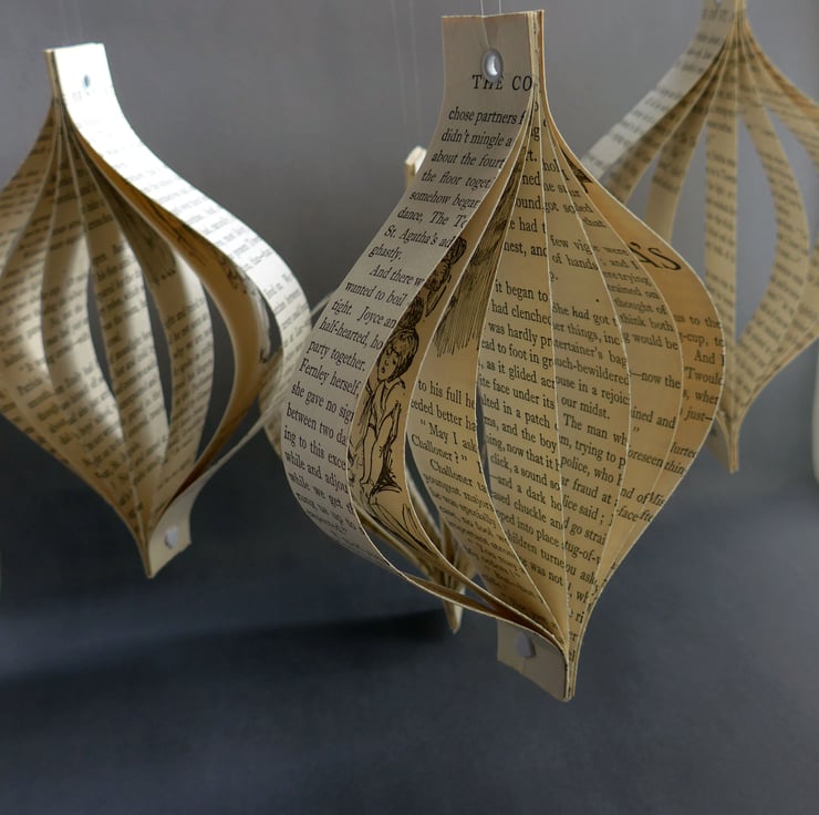 For each set, I handcut the pages of the book, and then fix them together to create a 3D shape. I supply clear thread so they can be hung straight on your tree or any other place you choose.