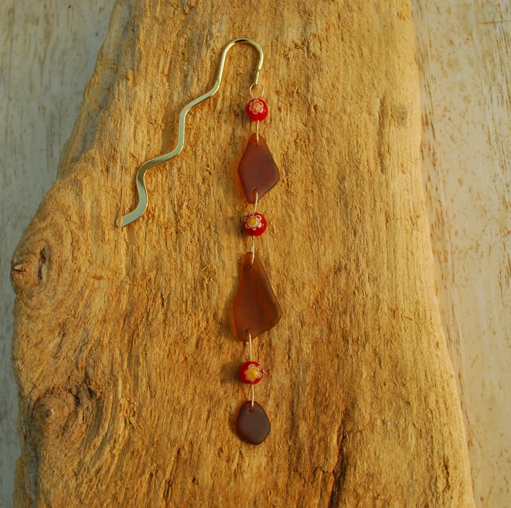 Red and yellow millefiori glass beads add interest and colour to the tumbled beach glass we've used for this bookmark. The pieces of glass have come from old bottles and are slightly curved. The matching shapes and warm colours in this bookmark look lovely together.