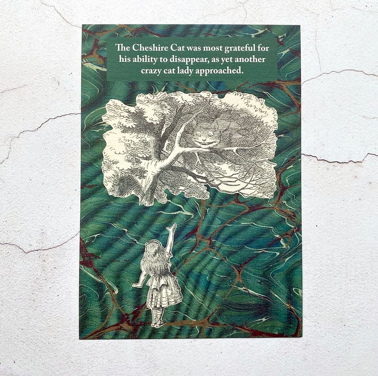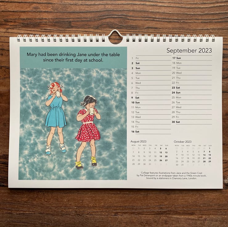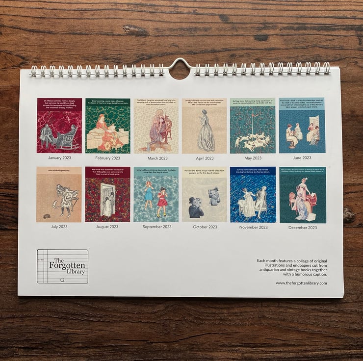 Each month features a different collage of antiquarian illustrations and endpapers with a humorous caption. Ranging from little known children's books to classic 19th century works of fiction.
