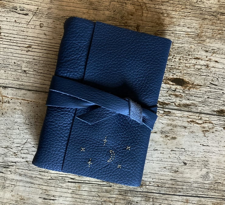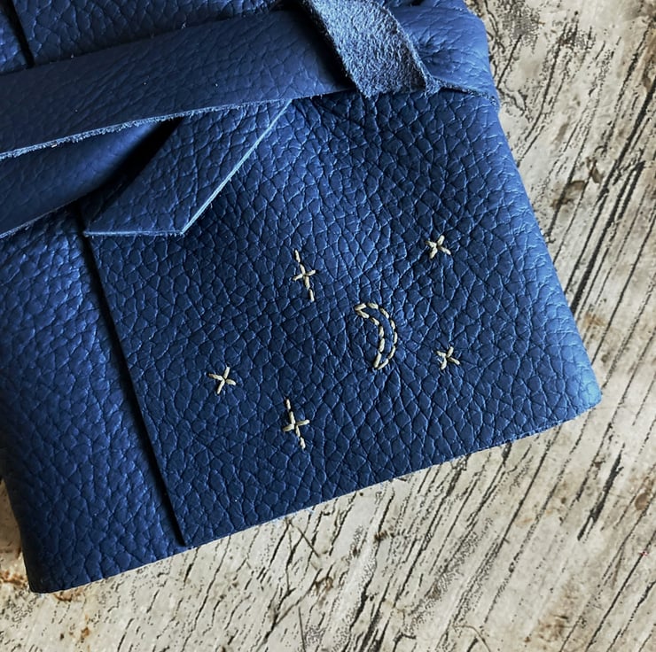 Part of my hand embroidered celestial collection - this Miniature crescent moon and scattered star embroidery is hand-sewn by me into your colour choice leather journal. The embroidery measures approximately 2" wide by 1 1/4" tall.