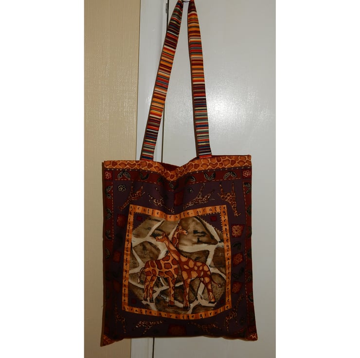 This is a spacious tote bag, with lots of room for shopping or books etc. It has long handles to carry it over the shoulder and is fully lined in a toning African animal print fabric. The bag is made from two panels featuring giraffes (on the back the panel is the reverse image of the front.) The bag measures 14 inches wide x 16 inches deep (36 x 41cm) and the handles are 26 inches long. (67cm)