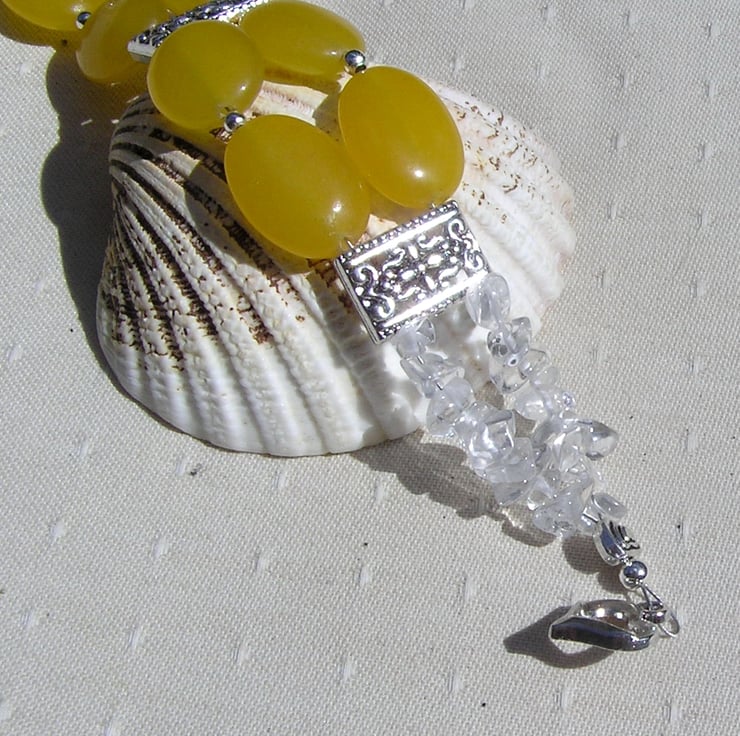 This Stunning Bracelet is made from Bright Yellow Jade Chunky Oval Beads and Clear Quartz Gem Chips… each section separated by an ornately decorated Tibetan Silver Bar Spacer with a tiny Silver Heart at each end - a Beautiful combination that will look stunning either worn casually or with something more Elegant for a Special Evening out