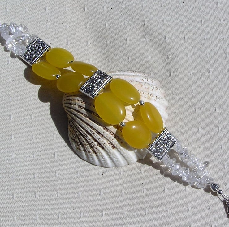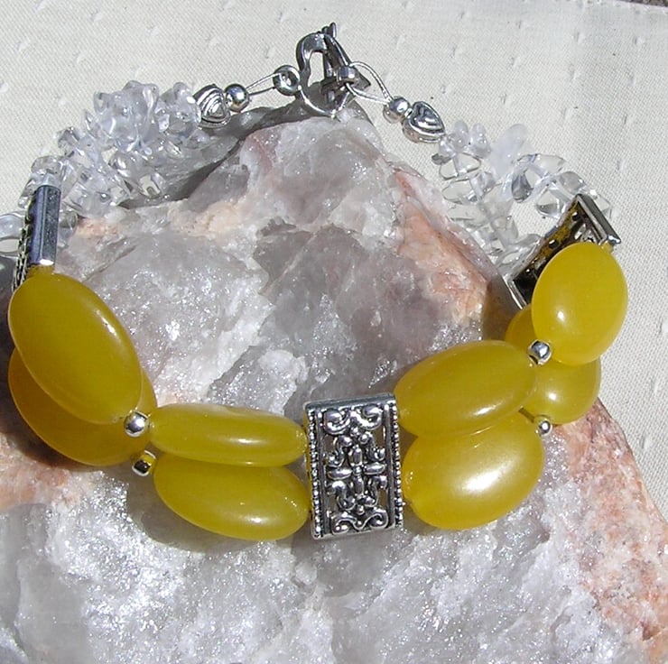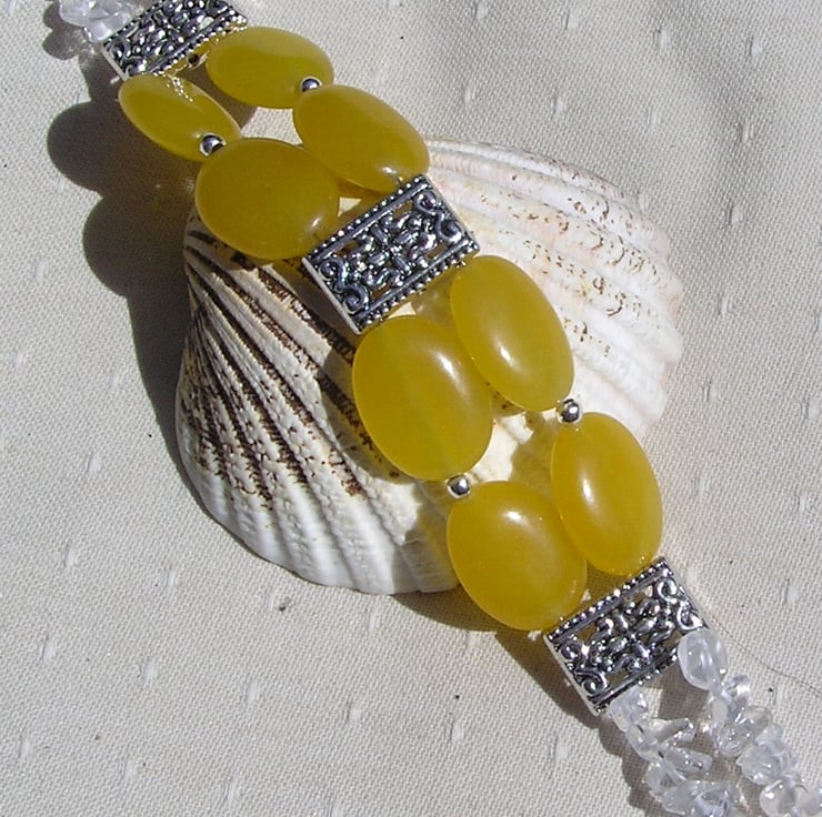 This Stunning Bracelet is made from Bright Yellow Jade Chunky Oval Beads and Clear Quartz Gem Chips… each section separated by an ornately decorated Tibetan Silver Bar Spacer with a tiny Silver Heart at each end - a Beautiful combination that will look stunning either worn casually or with something more Elegant for a Special Evening out