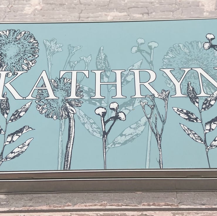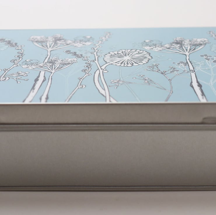 This collection features a combination of Gerbras and greenery that I have grown in my garden. I use the stems of the flowers to create a series of mono prints using my Gelli plate. These are then scanned and digitally layered to create a final design. Each tin is individually printed with my Gerbra design and personalised as required.
