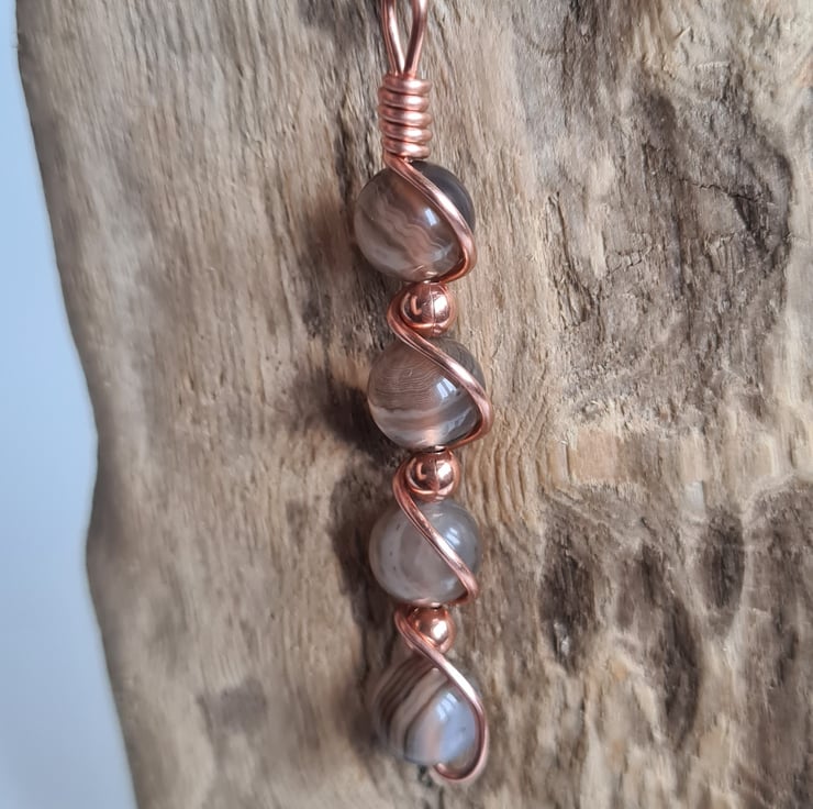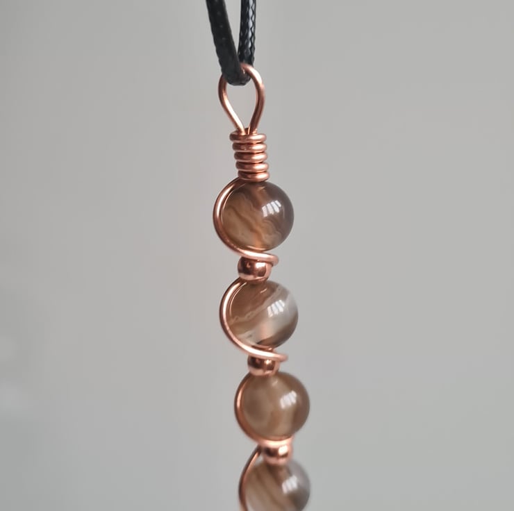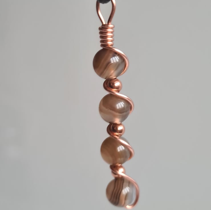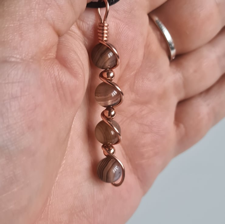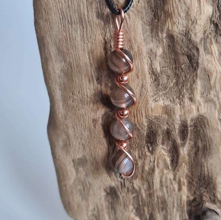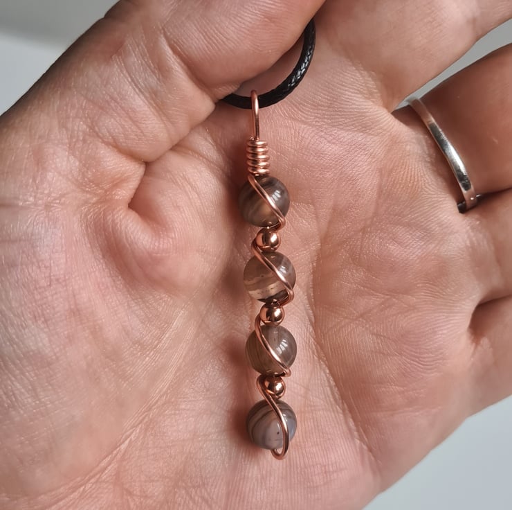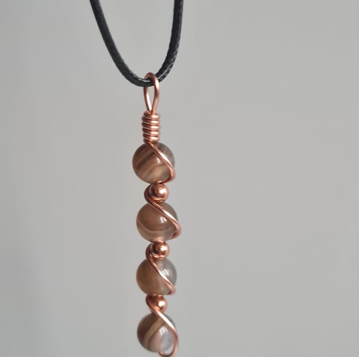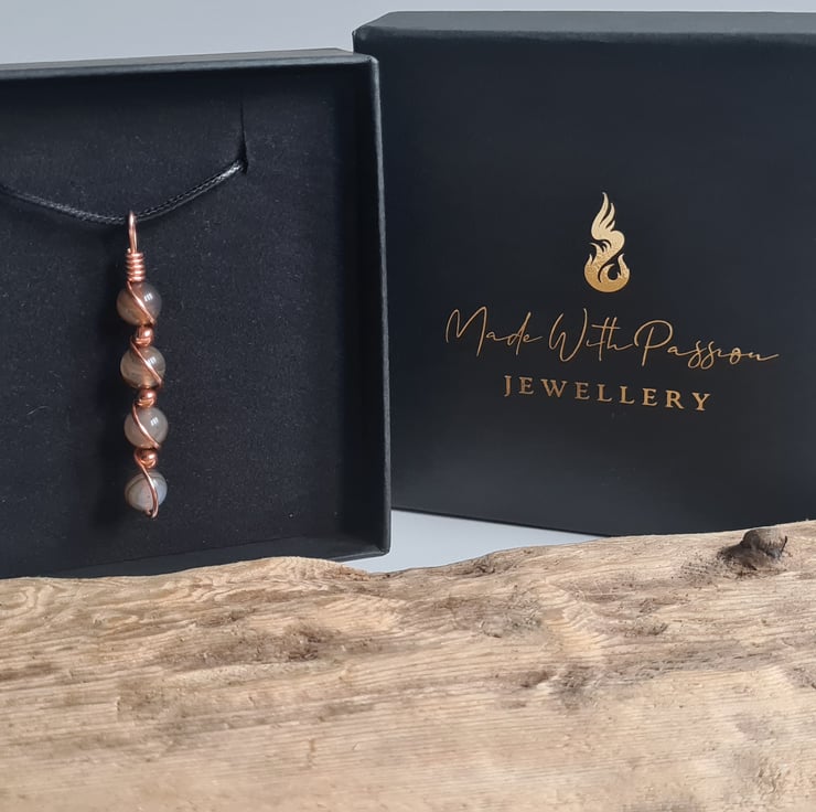 I have wrapped these beautiful Natural Pale Brown Banded Agate & copper beads in copper and the pendant comes on an adjustable black cord necklace and gift boxed.