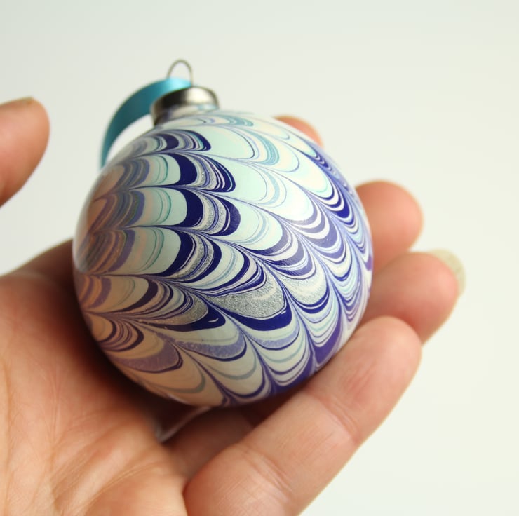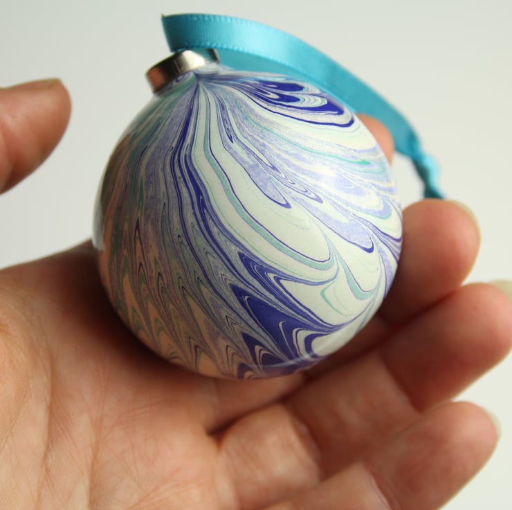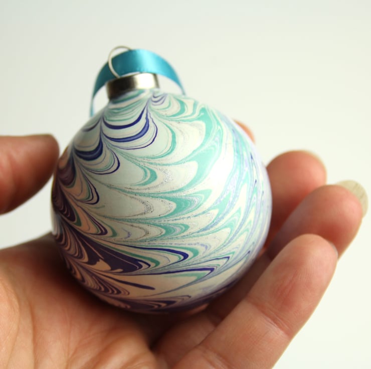 The baubles in this range are marbled directly onto the ceramic surface - a technique which is much more difficult than it sounds! Each bauble is marbled from a different bath, so they are all different and totally unique. They are lots of fun to make and totally addictive!