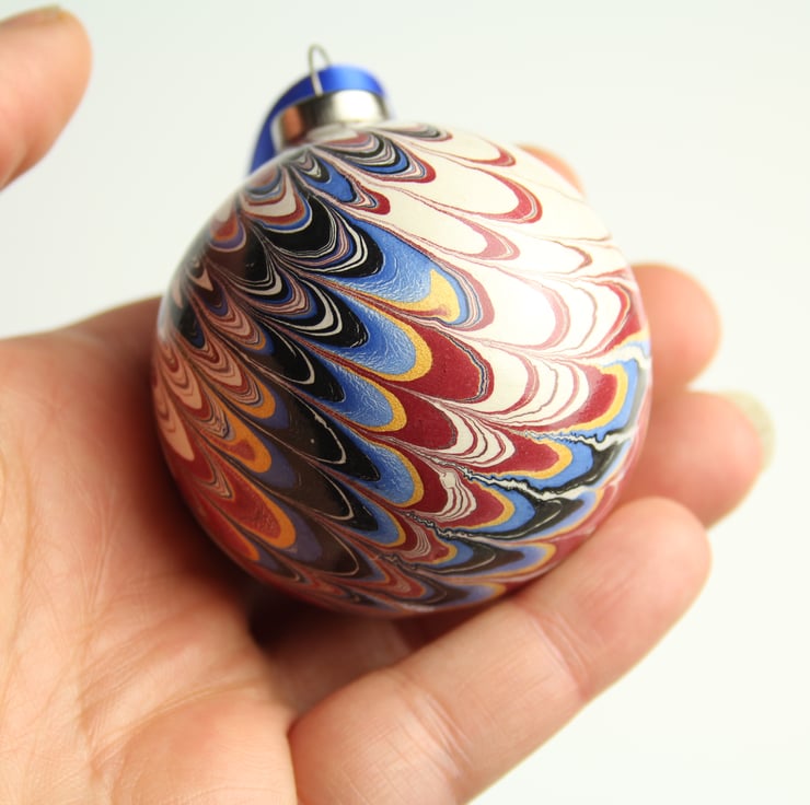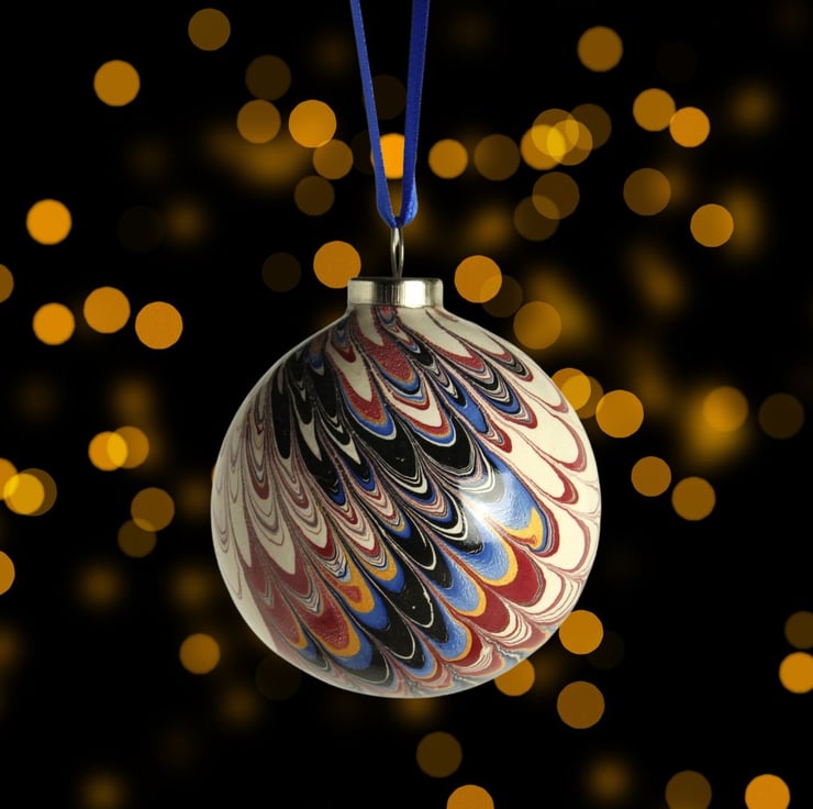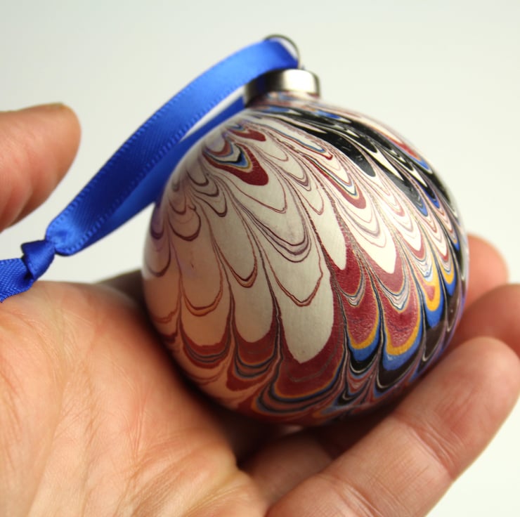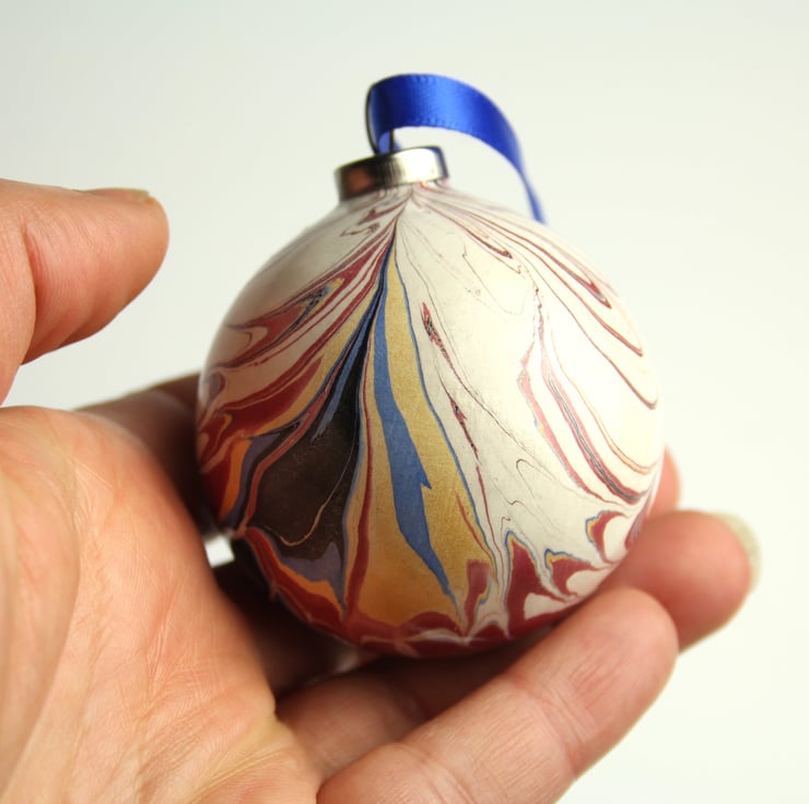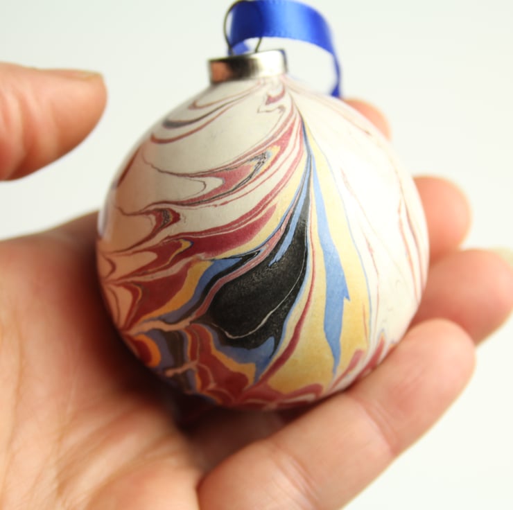 The baubles in this range are marbled directly onto the ceramic surface - a technique which is much more difficult than it sounds! Each bauble is marbled from a different bath, so they are all different and totally unique. They are lots of fun to make and totally addictive!