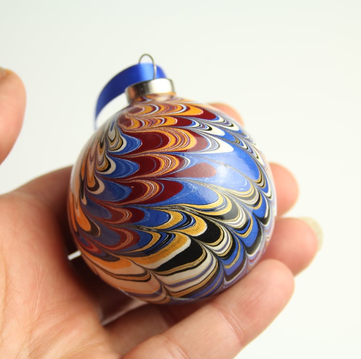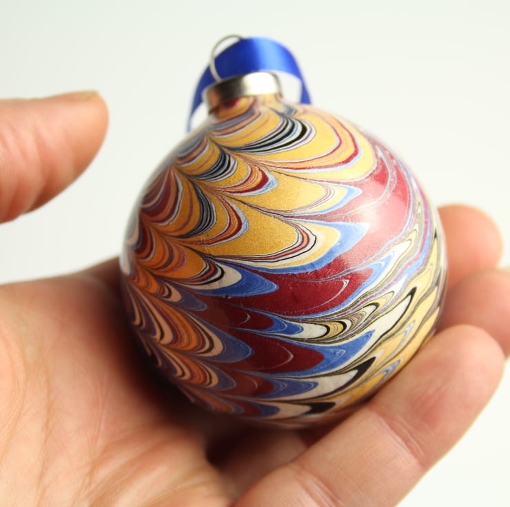 The baubles in this range are marbled directly onto the ceramic surface - a technique which is much more difficult than it sounds! Each bauble is marbled from a different bath, so they are all different and totally unique. They are lots of fun to make and totally addictive!