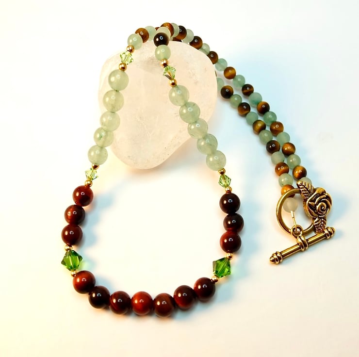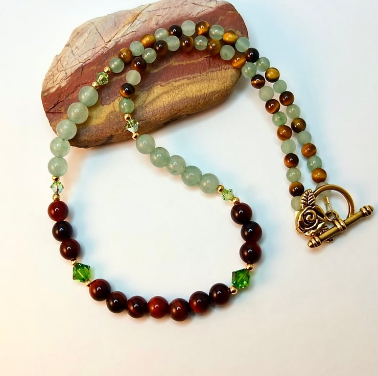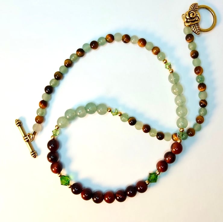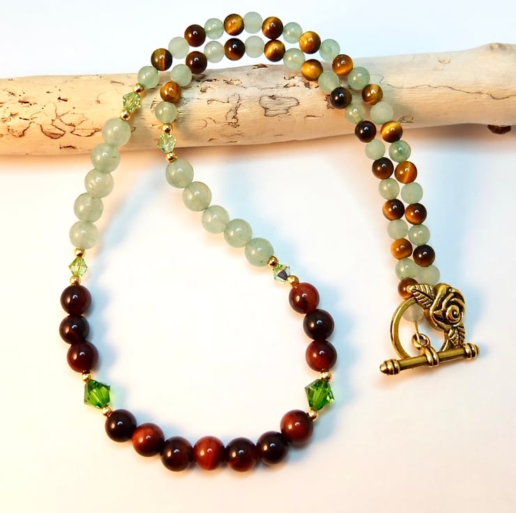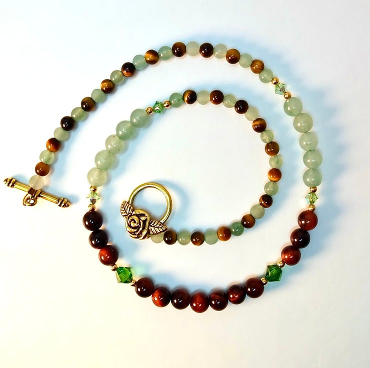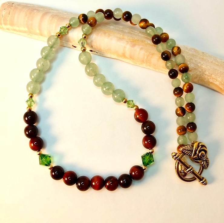 This beautiful necklace in soft, woodland colours, is made from 6mm red Tiger's Eye and green Aventurine beads, graduating to a mix of 4mm polished and frosted green Aventurine with 4mm golden Tiger's Eye.