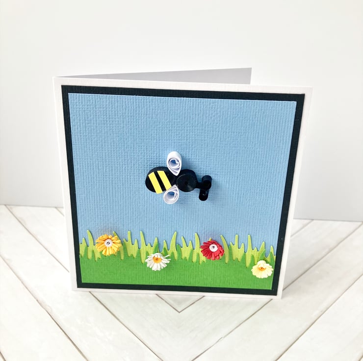 This is a lovely collection of 4 quilled cards measuring 4 by 4 inches (10cm approx). Each three-dimensional card features a quilled bee buzzing happily above a pretty garden of quilled flowers.