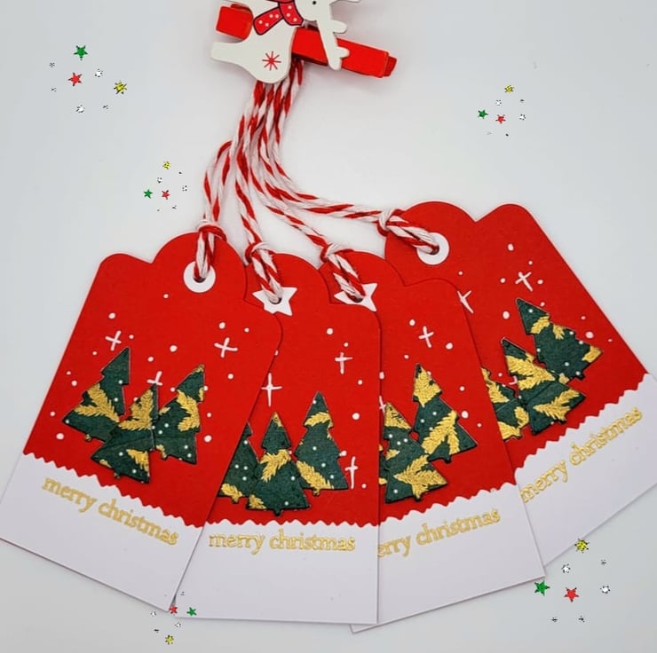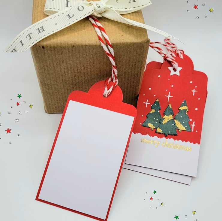 Each of the four christmas tree tags have been individually handmade, using quality red card and has a blank white card on the back. The tags in the set measure 5.25 x 9.25 cms and have a reinforced white circle or star at the fixing. Finished with white and red cotton bakers twine. Designed and handmade by me, in my craft room, to jazz up your christmas gift.