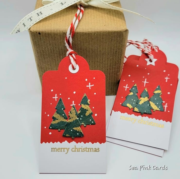 A set of 4, festive red handmade gift tags. Each layered tag has a hand-cut snowy border and dark green and gold trees. With a gold heat embossed MERRY CHRISTMAS in a stylish font. A traditional theme given a contemporary twist!