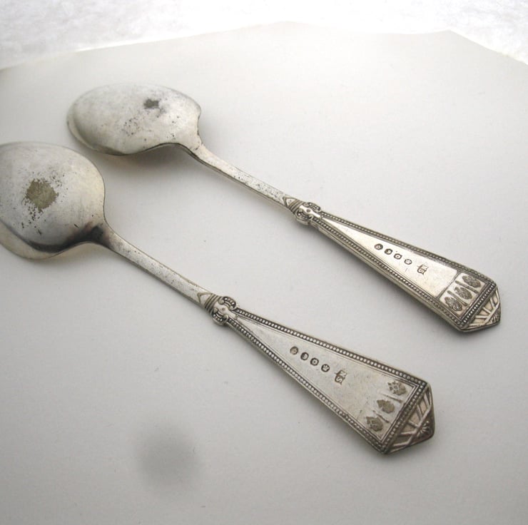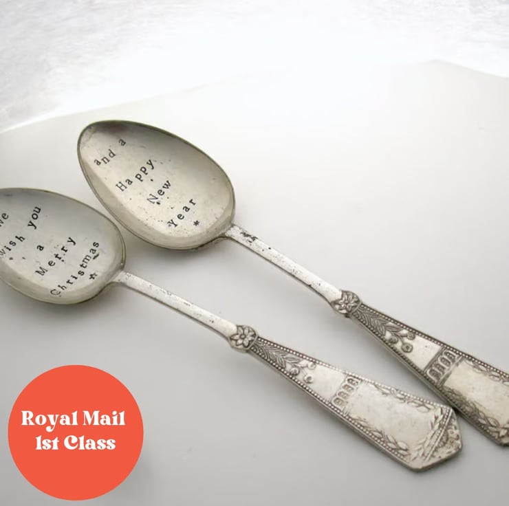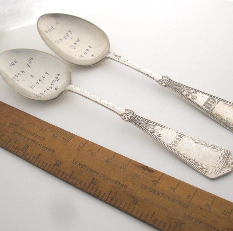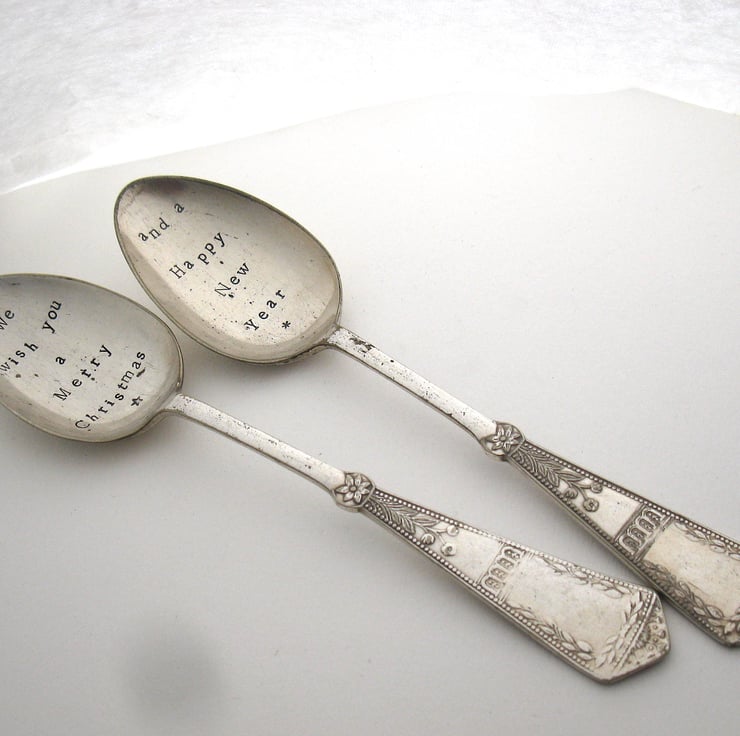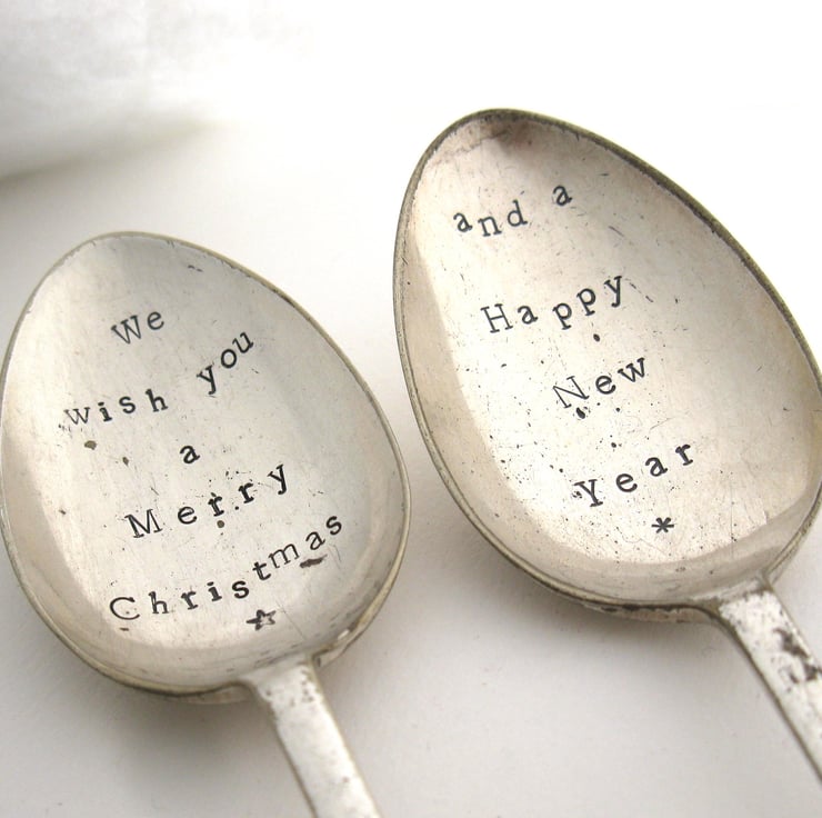 Matching Victorian silver-plated spoons handstamped with 'We wish you a Merry Christmas' and 'and a Happy New Year'. A fun way to make your festive dinner table just that bit more festive! Or a nice little gift for friends, neighbours, relations or the office secret santa.