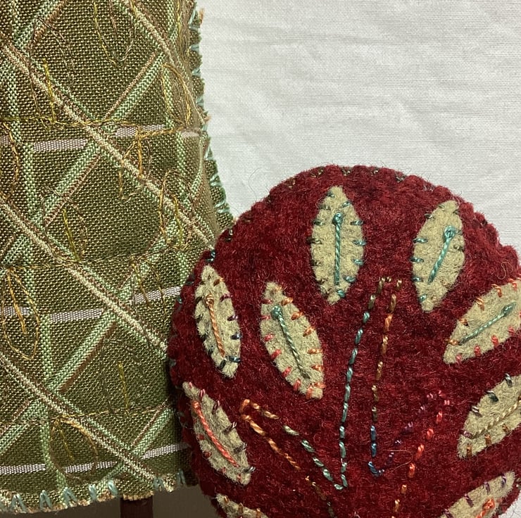 A great little combination of a vintage upholstery fabric and a wool felt tree hand appliqué leaves. I use lovely variegate thread to add further detail.