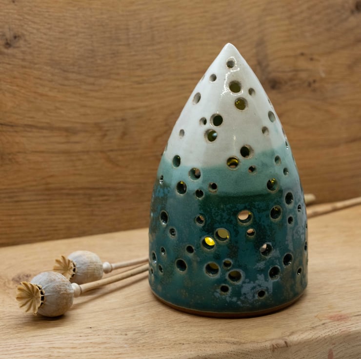 Thrown on the potters wheel in strong red stoneware and pierced with a hand tool to produce a sparkly warm glow from a tea light candle.