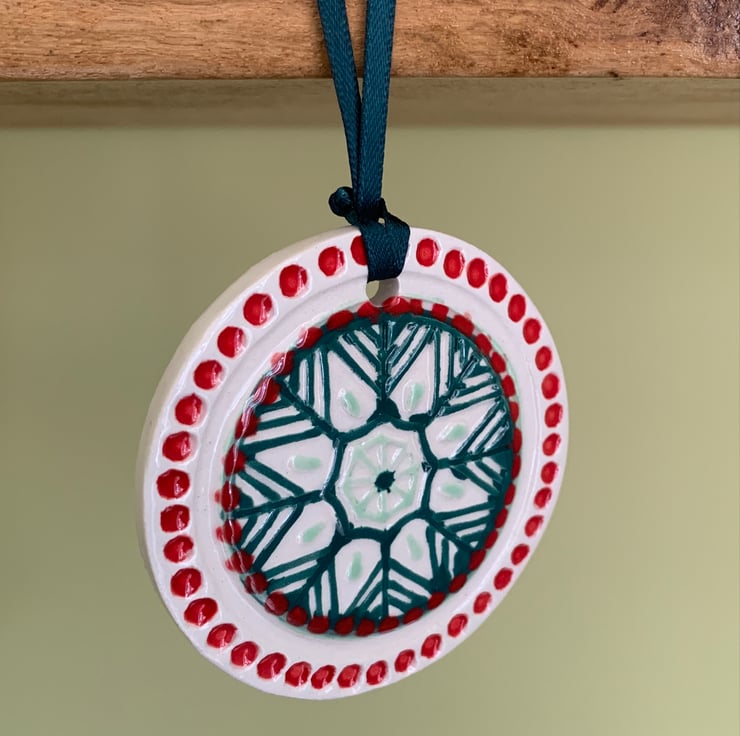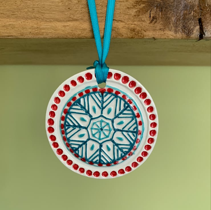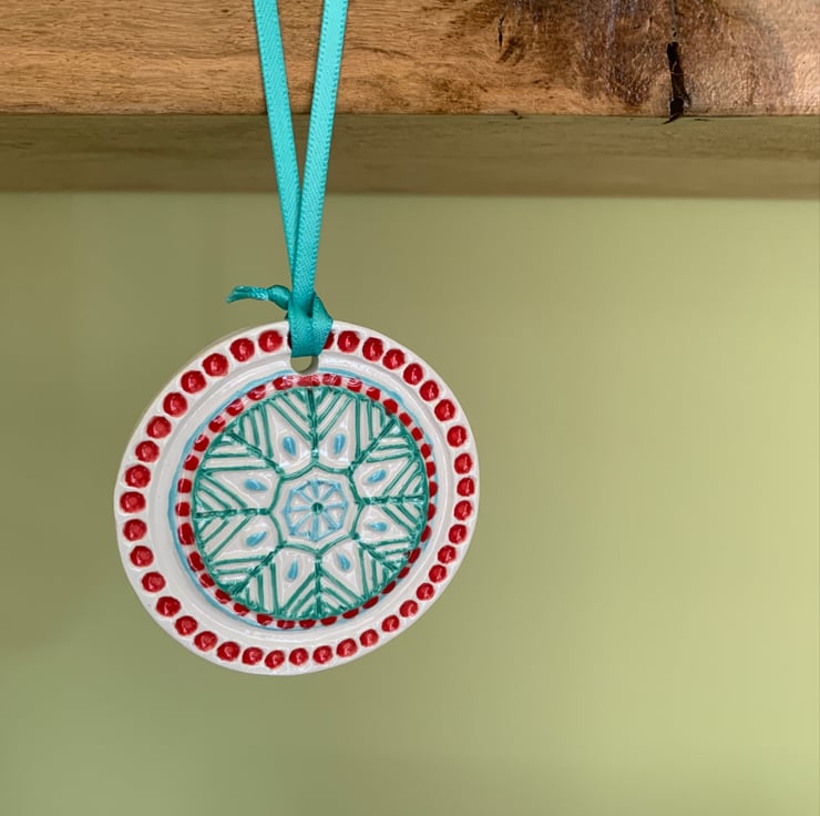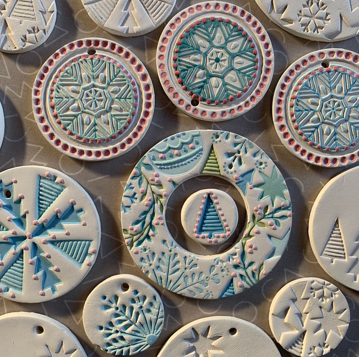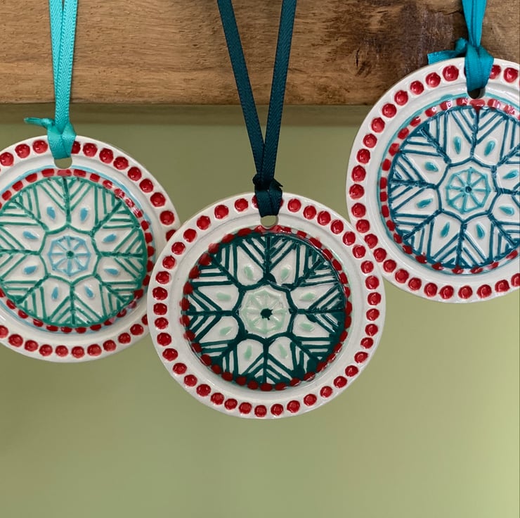 Next to the fun bit, applying colour! I hand paint each hanger using a combination of Red/Teal festive coloured underglazes. Before dipping in a glossy transparent glaze and firing for the final time. Each piece is strung with a complimentary coloured ribbon and ta-da they are ready to hang!