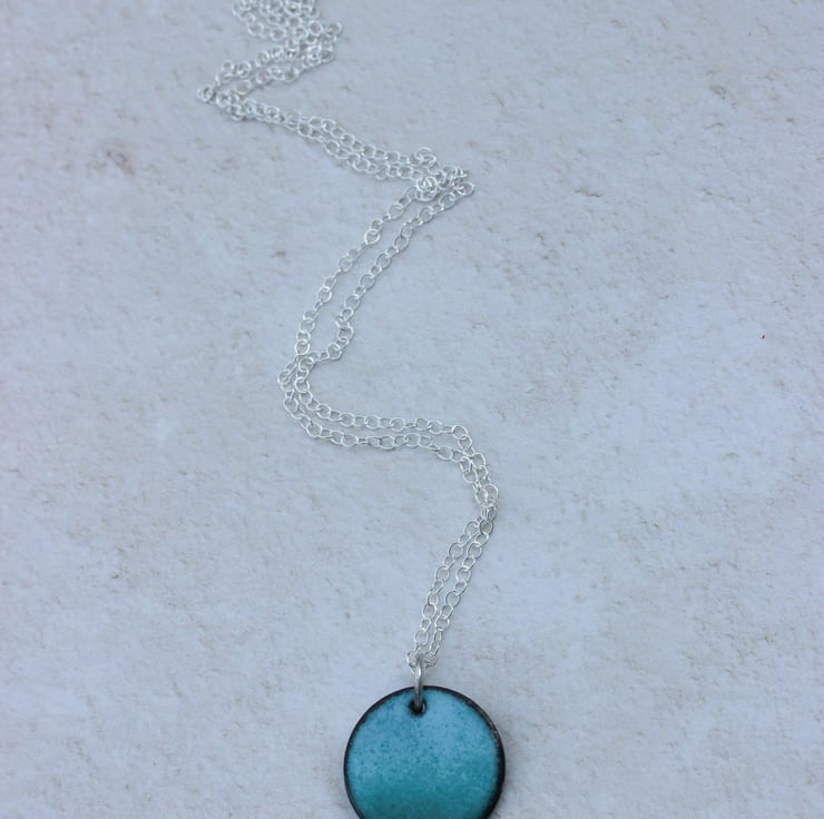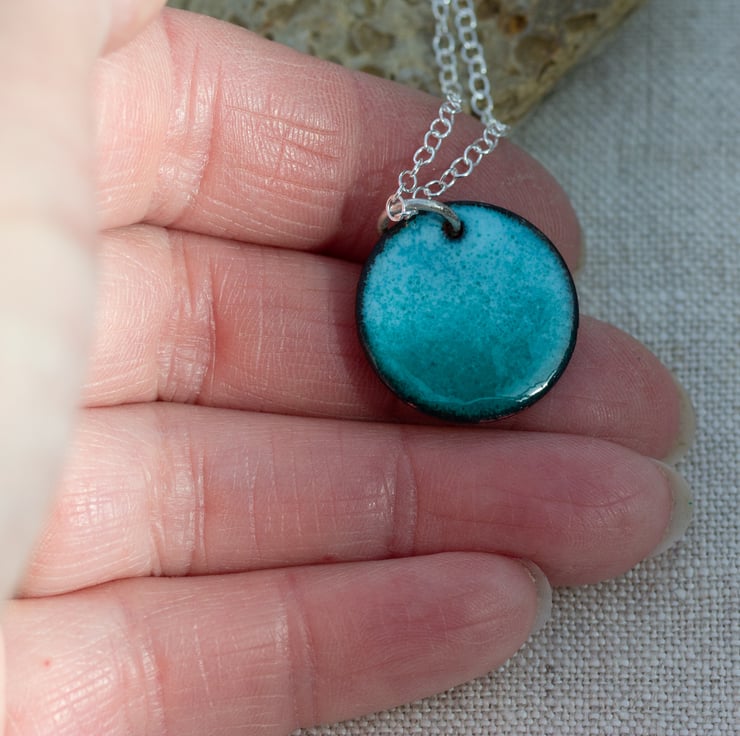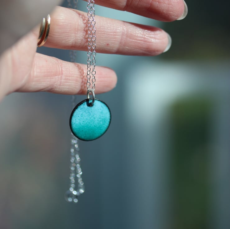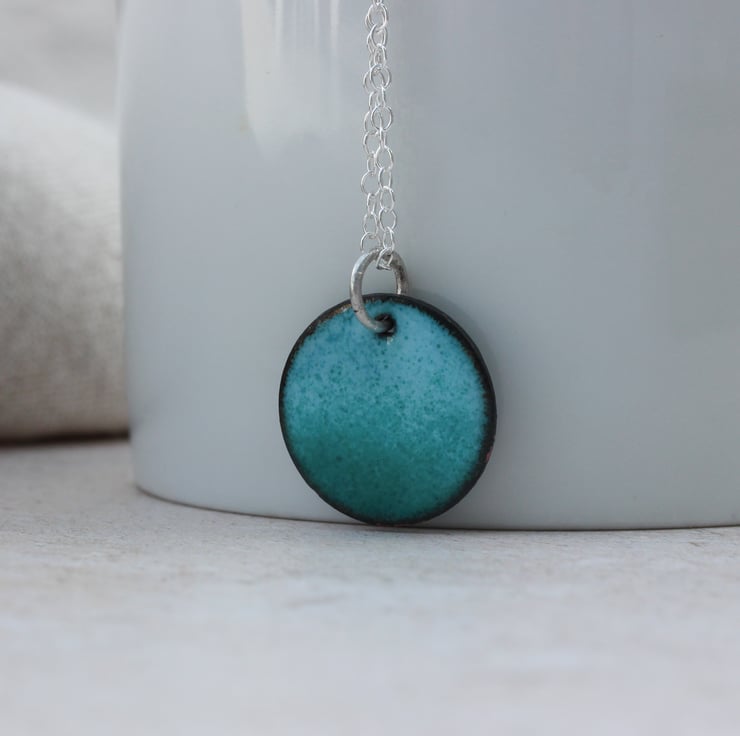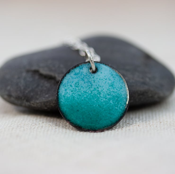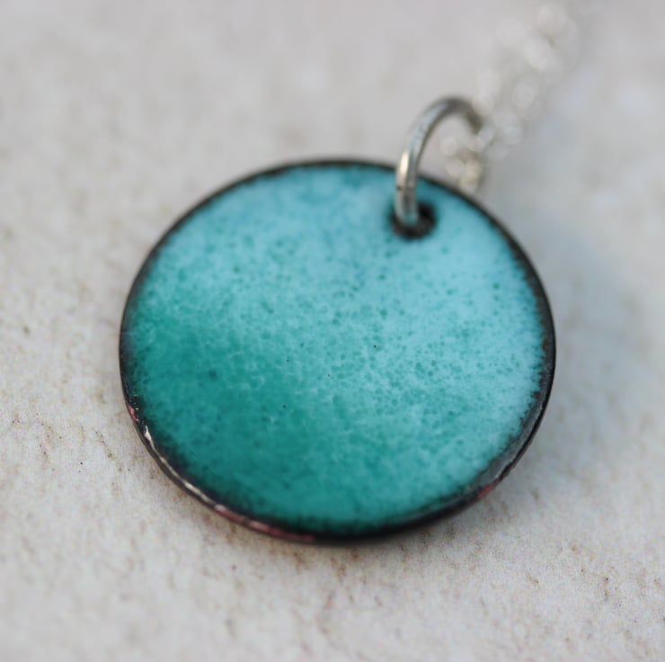 This copper circle pendant has been enamelled with turquoise and green opaque and transparent powdered glass. The pendant is fired in a kiln to fuse the enamel powder and create a glossy finish.