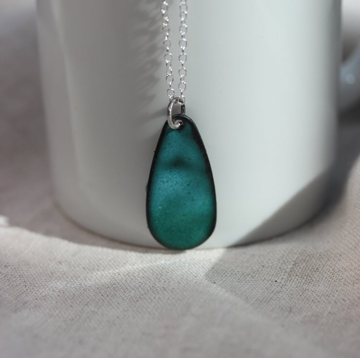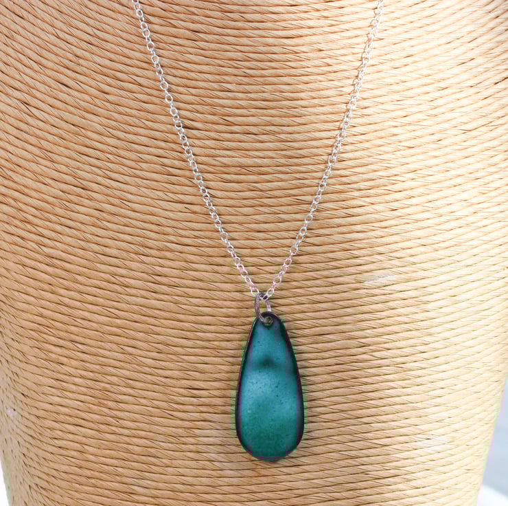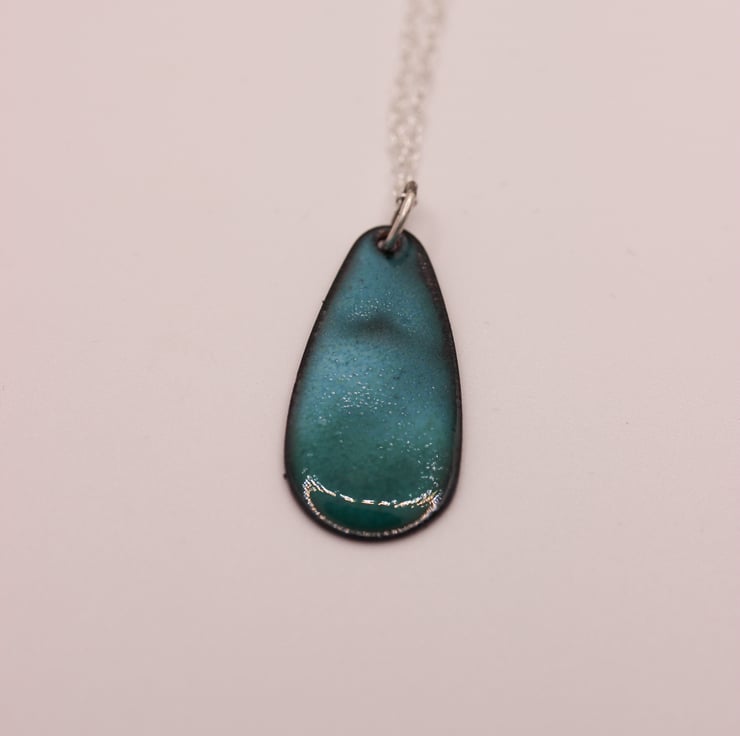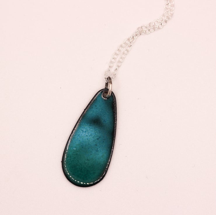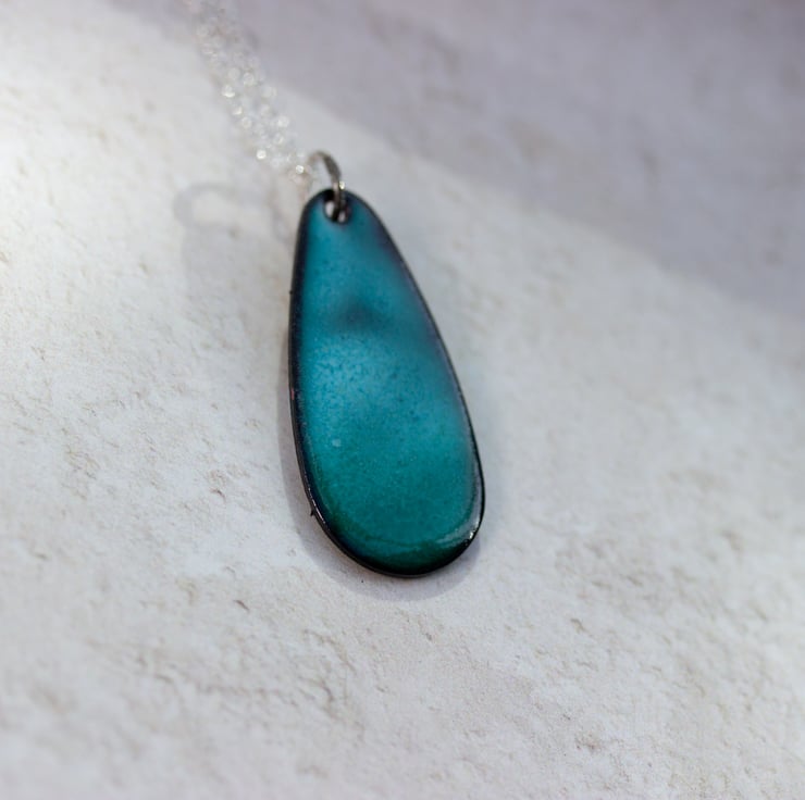 Teardrop enamel pendant comes with an 18 inch/46cm Sterling silver trace chain.