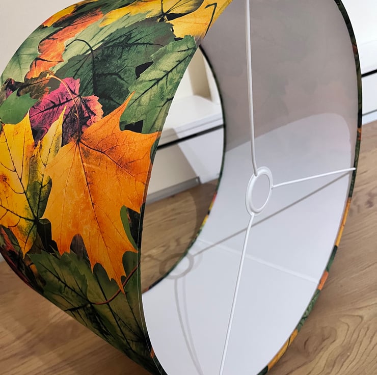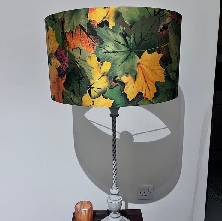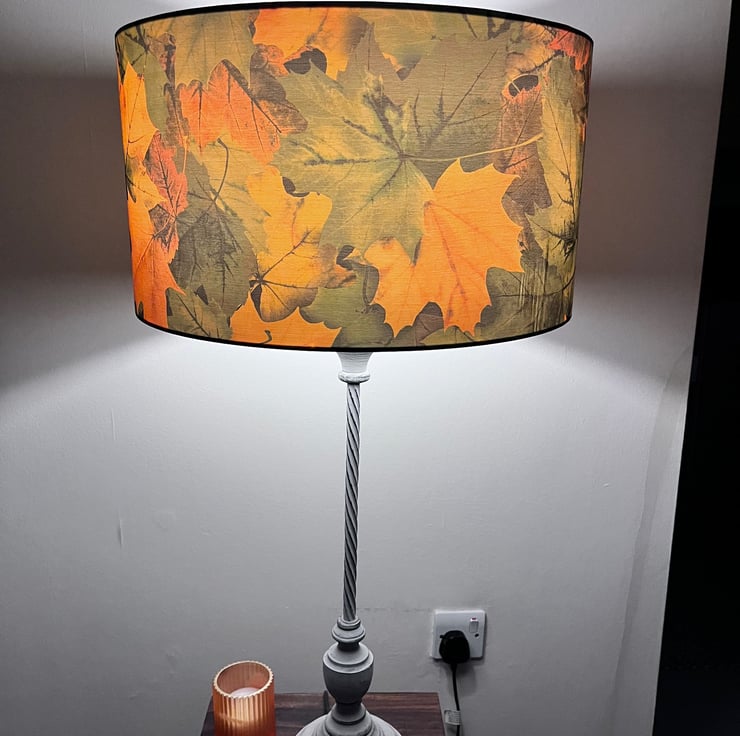 Silky soft fabric lampshade in beautiful green and orange autumn colours leaf print