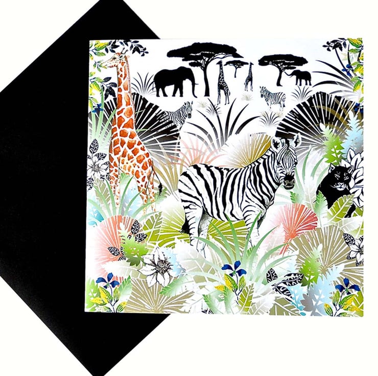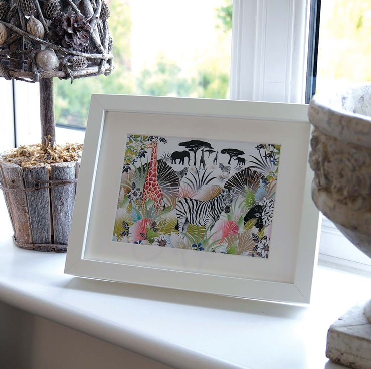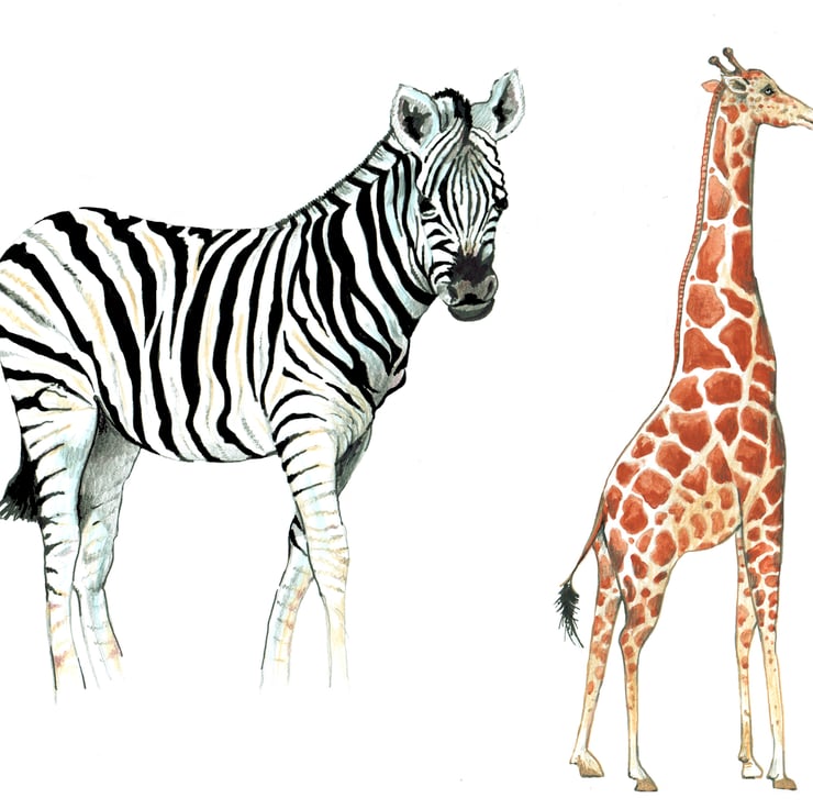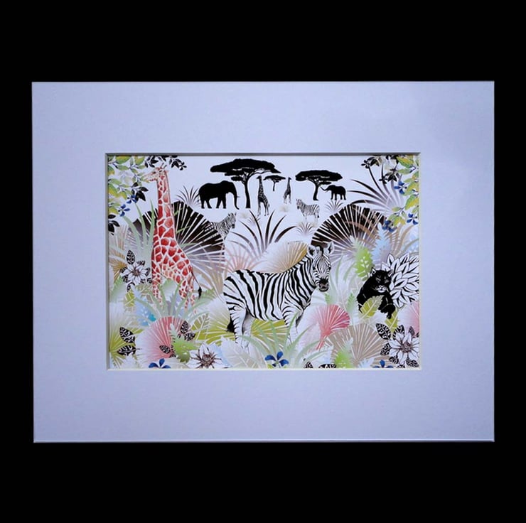 The Zebra Secret Safari's hand-painted Zebra and Giraffe seem quite at home in my imaginary safari scene. They come to life on a decorative tropical foliage background parts hand painted others created in Illustrator. A perfect print for an office, living area or a child's bedroom.