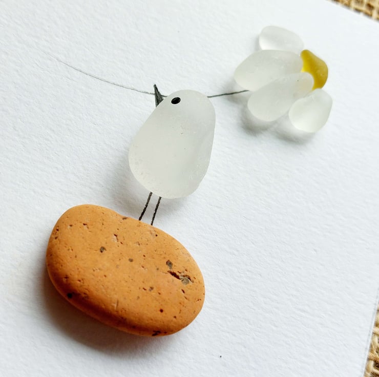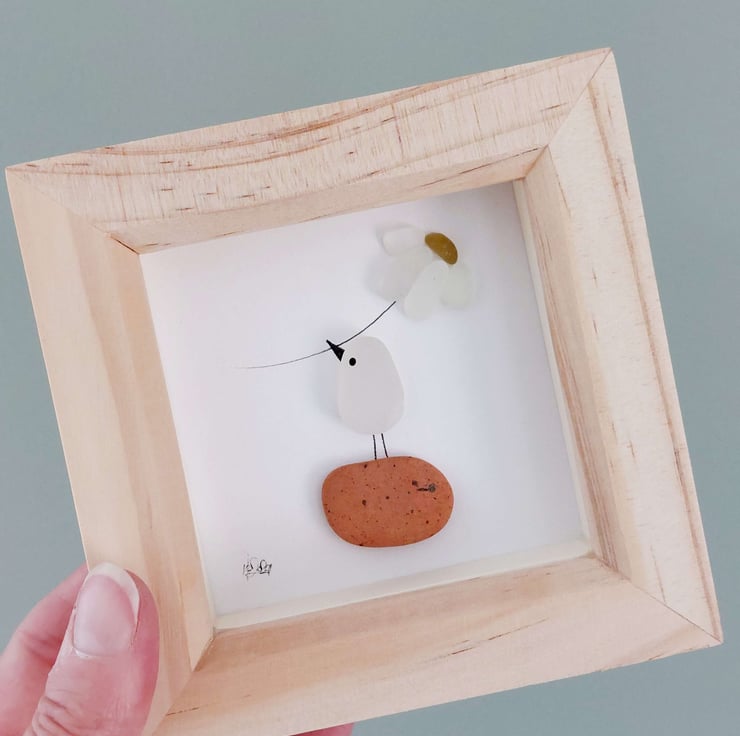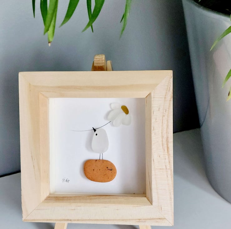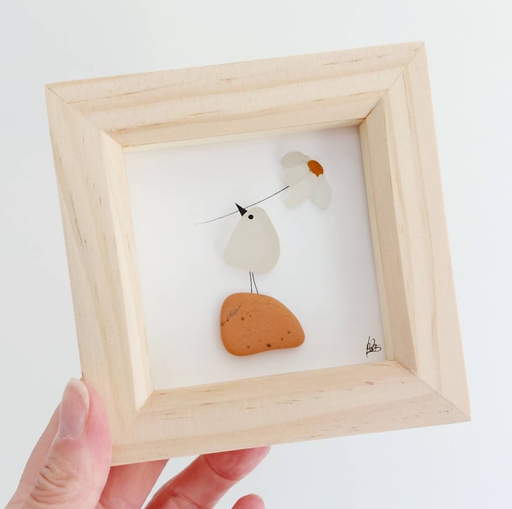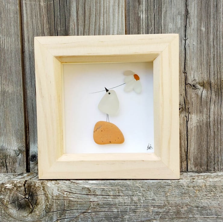 This delightful sea glass picture is crafted from sea tumbled pieces collected on my beachy travels and makes a thoughtful gift for a variety of occasions. It shows a cute sea glass bird, perched on a pebble, holding a daisy. The hand picked sea glass is naturally frosted and the picture is presented in a pine frame with a hook on the back. Alternatively, add a cute stand to display it on a surface.