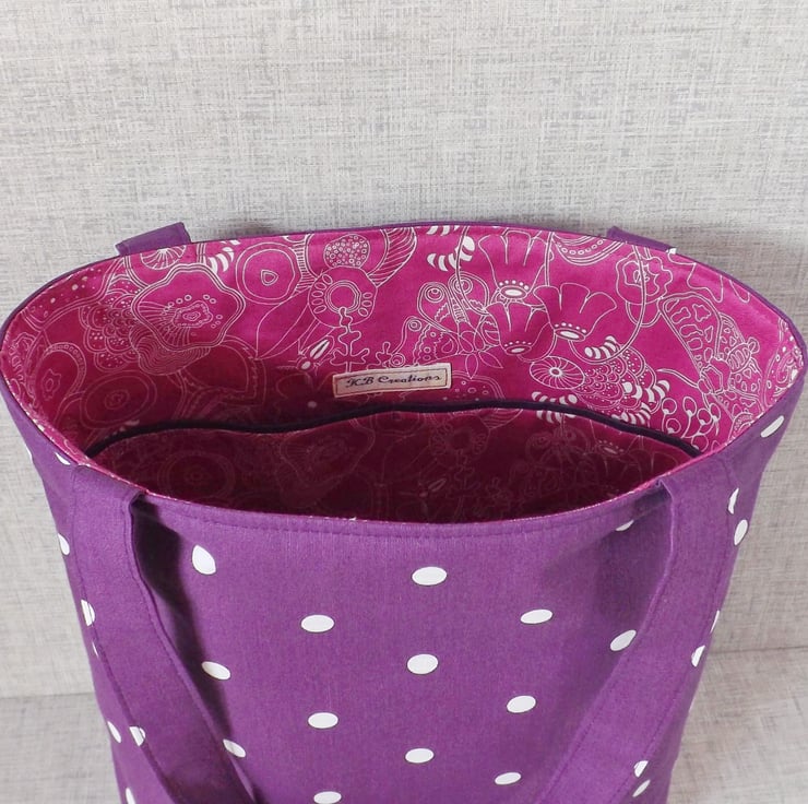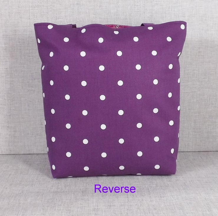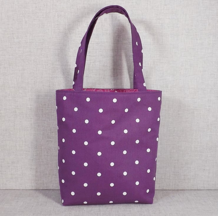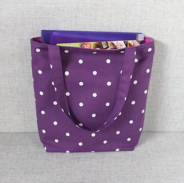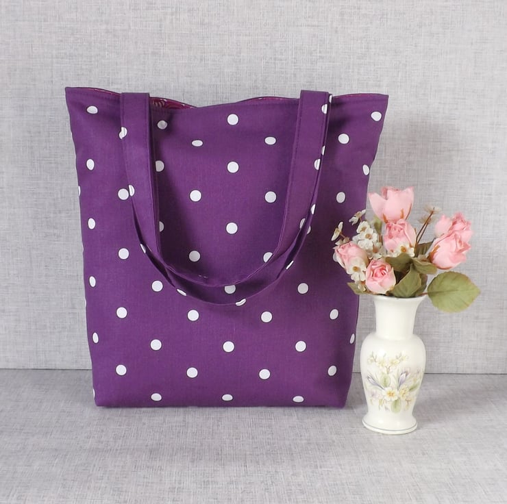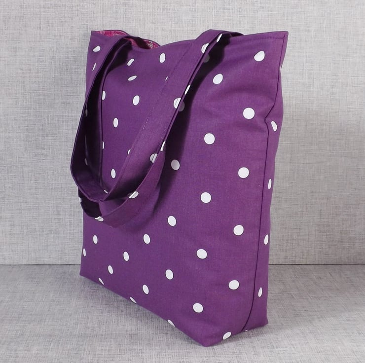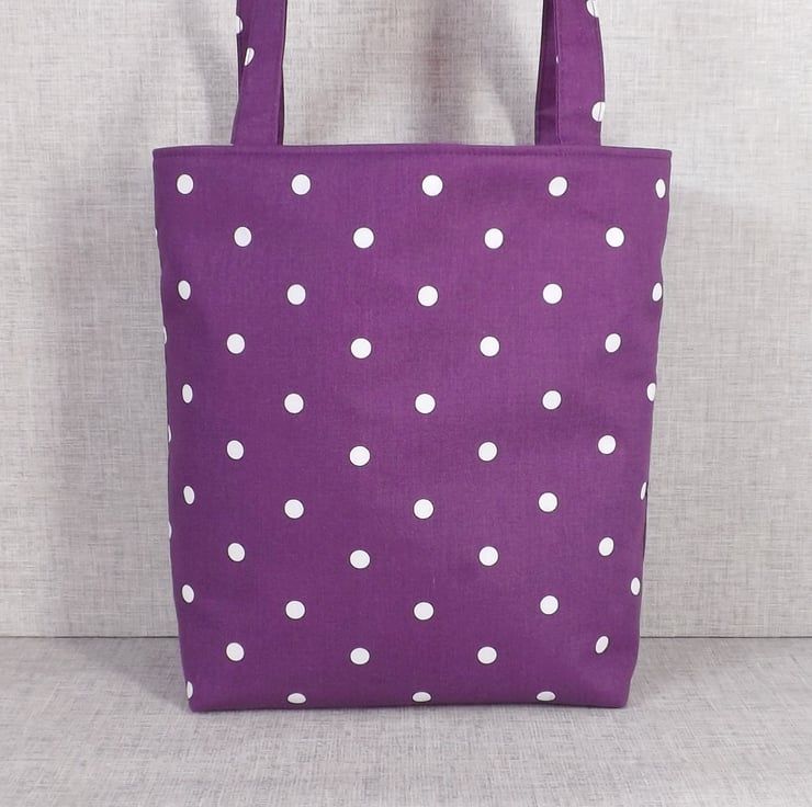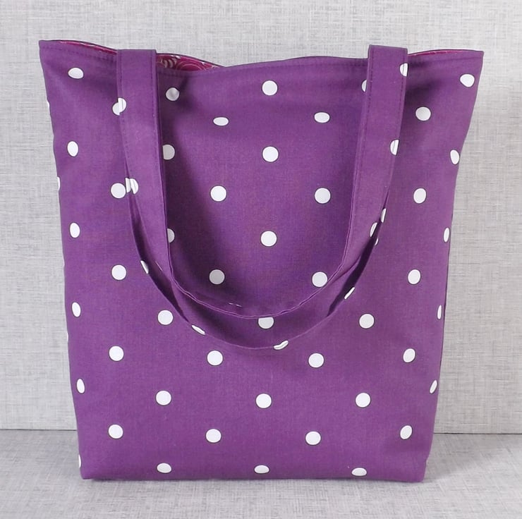 A medium sized strong tote bag, shopping bag, made from a purple cotton fabric with white spots.