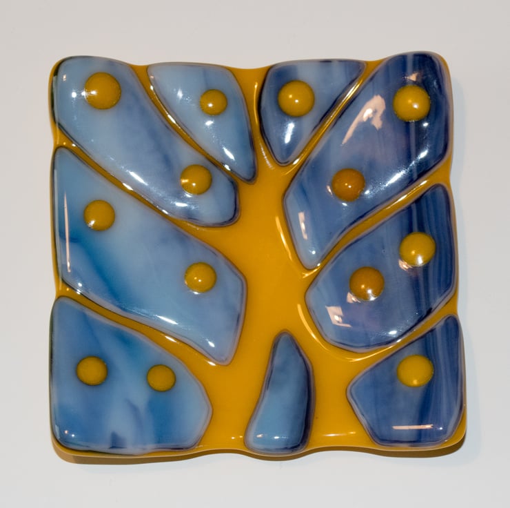 We make this design using a sheet of coloured glass, hand-cut to the required size for the base. We then take a second sheet cut slightly smaller and cut out the tree-shaped pieces, again by hand. These are arranged on the base sheet and the sheet is decorated with pieces of crushed glass (frit) and pre-fused glass dots. The first visit to the kiln fuses all the glass into a single sheet, but unlike some of our other pieces, there is a smoother texture to the tree shape. A second visit to the kiln is required to create the dish shape.