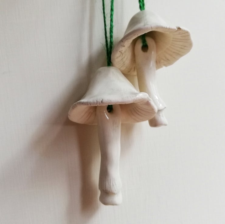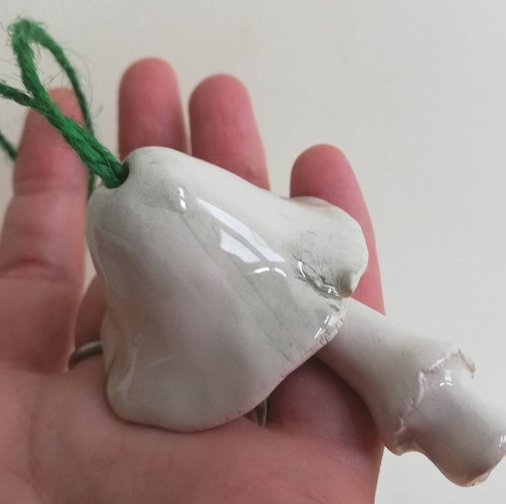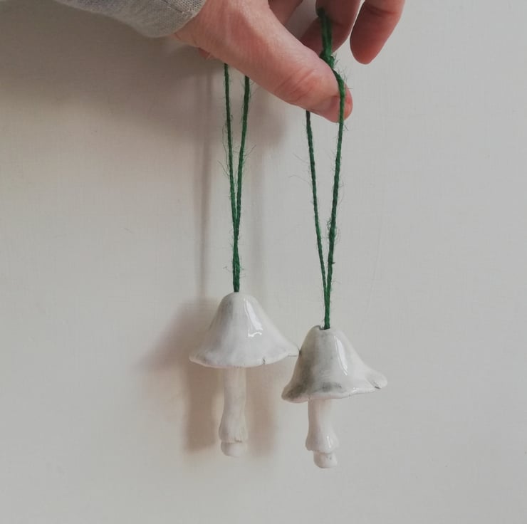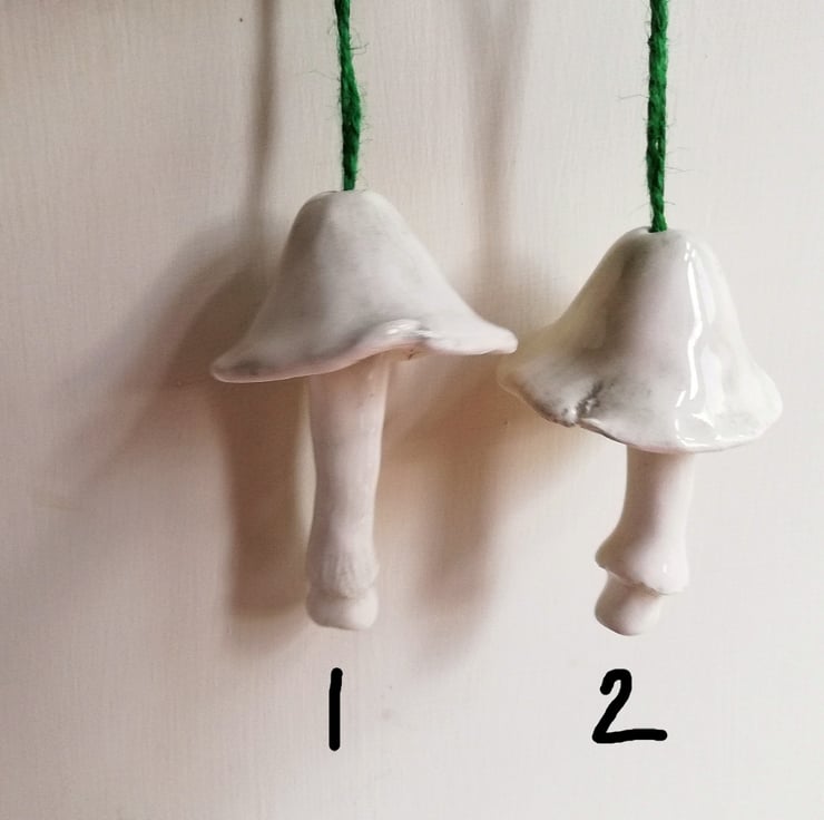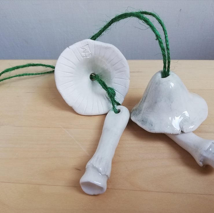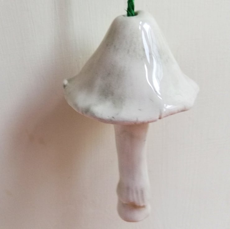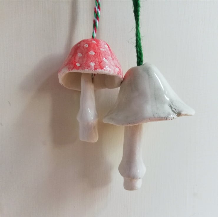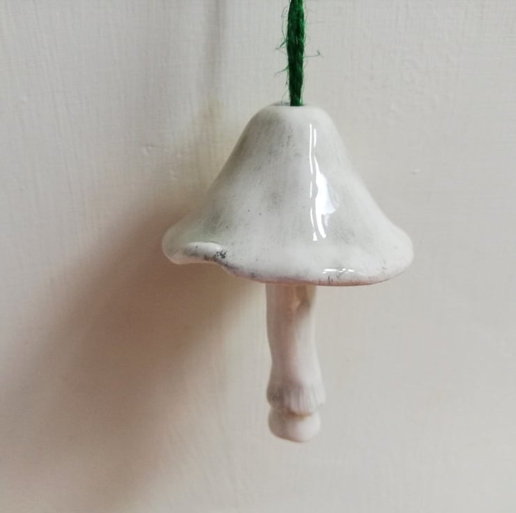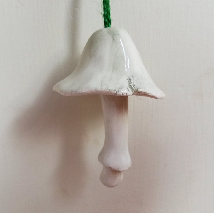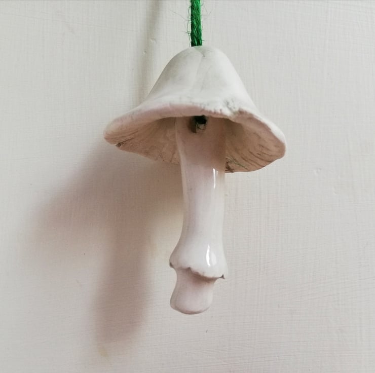 Handmade and hand painted pottery bell in the shape of a mushroom with stalk clanger, to hang as Christmas tree decor. Each make a delicate tinkling sound. There is only design 1 mushroom left.