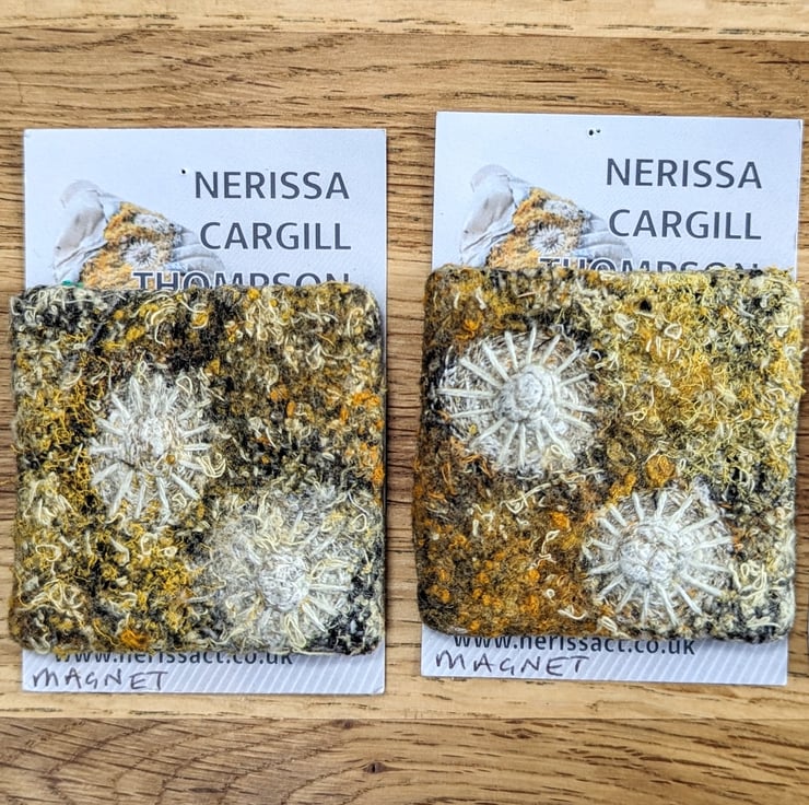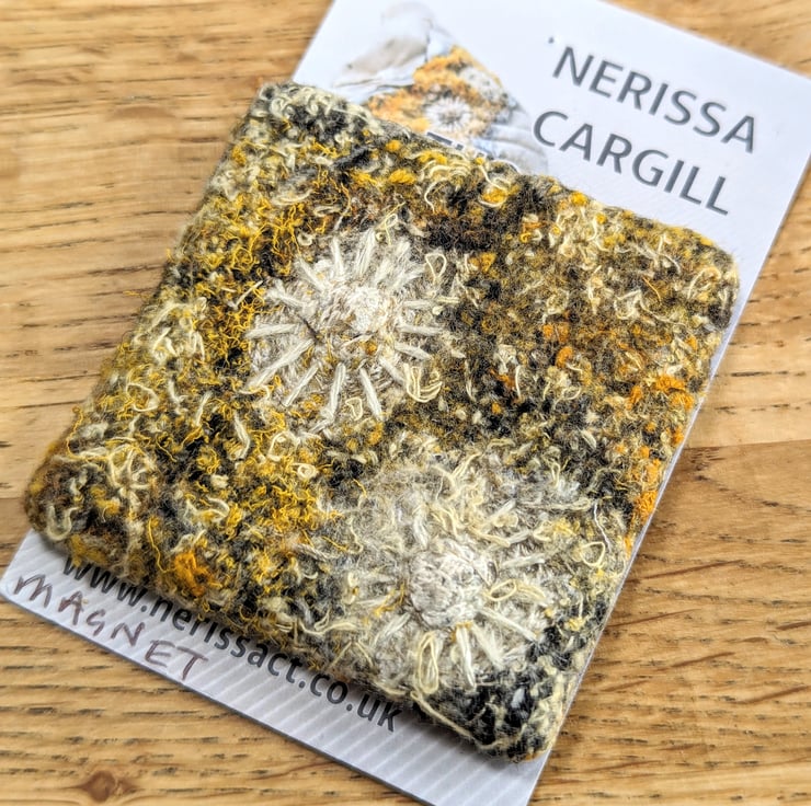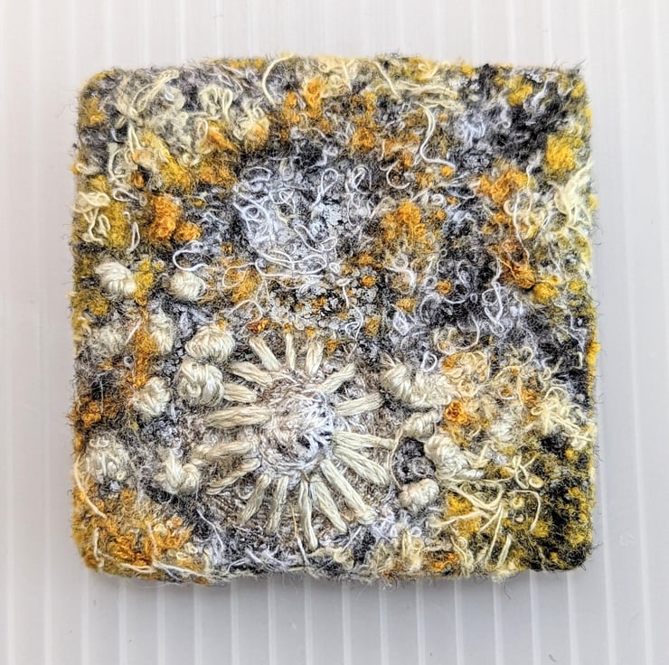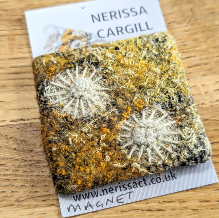 Unique piece of textile art, perfect for sea lovers. Recycled fabric embellished and embroidered with coastal inspired textures in a bold palette of golden yellow tones with hand finished shell motifs.