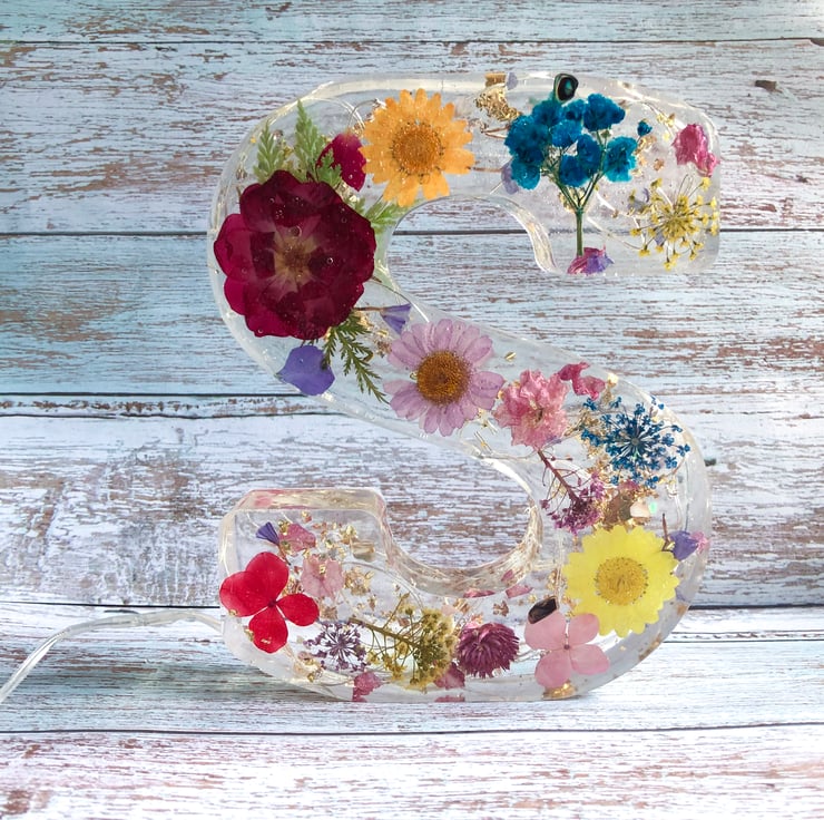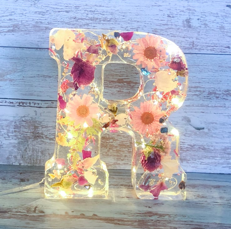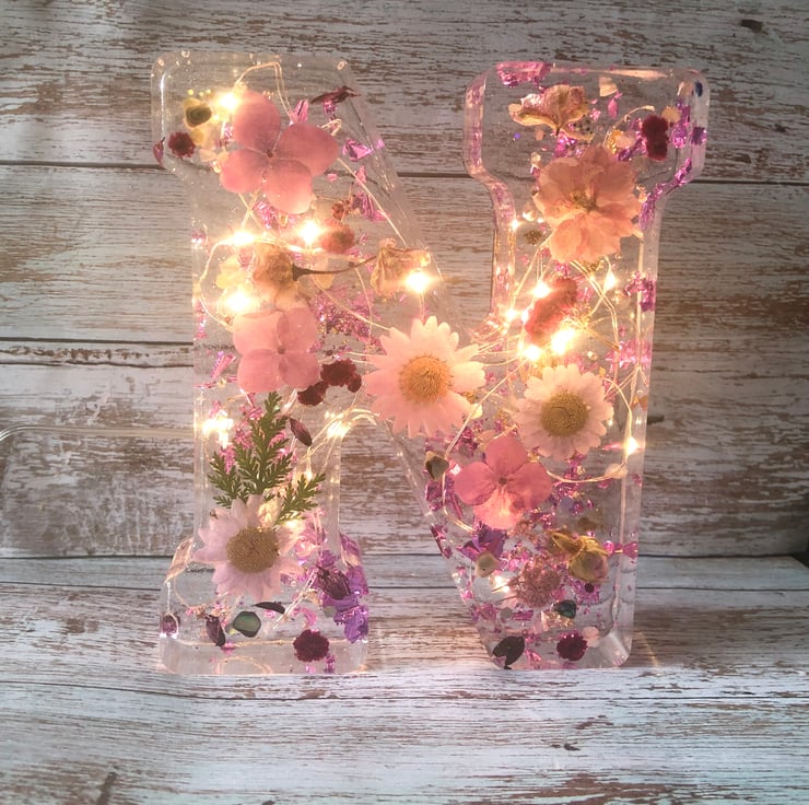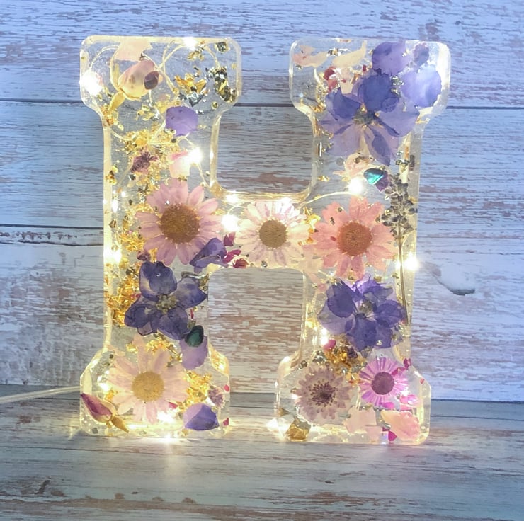 Create your own floral freestanding light up letters, custom name gift, personalized gifts sign, single letter or phrase with these beautiful dried flower petal resin art letters lamps. A Beautiful personalized keepsake to decorate your space.