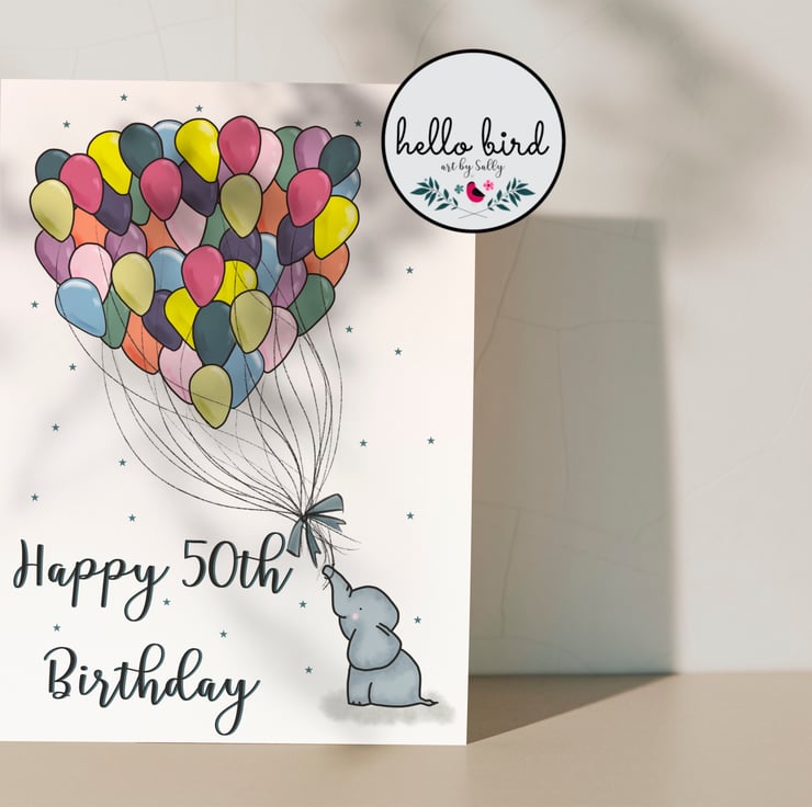 50th birthday card featuring a rather cute baby elephant holdng on to 50 individually drawn birthday balloons.