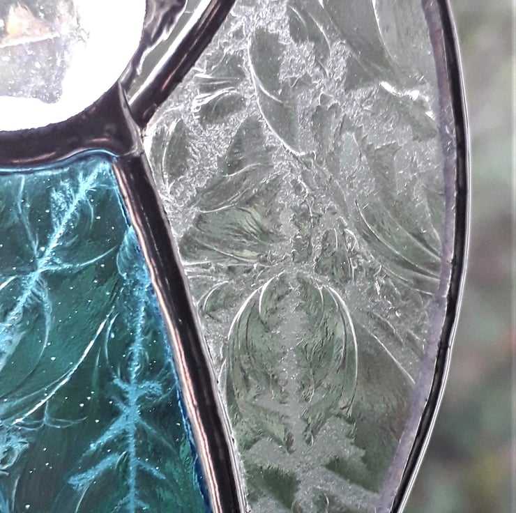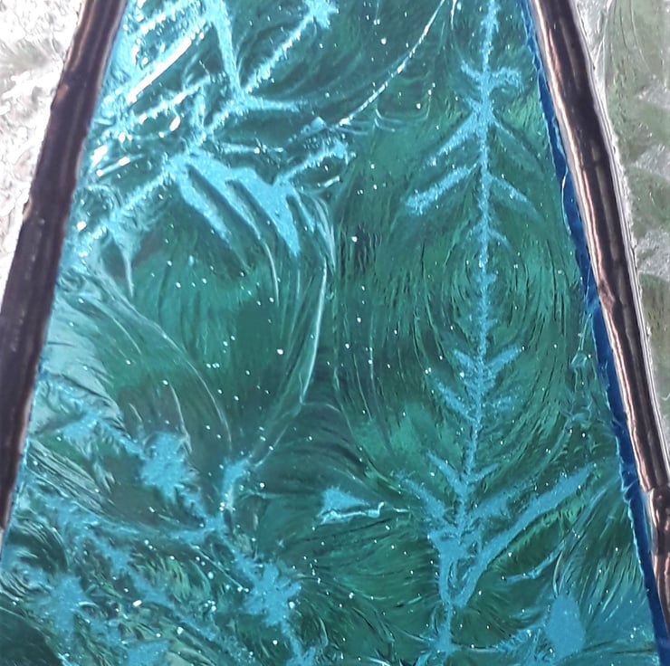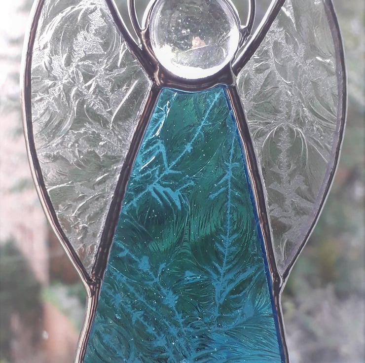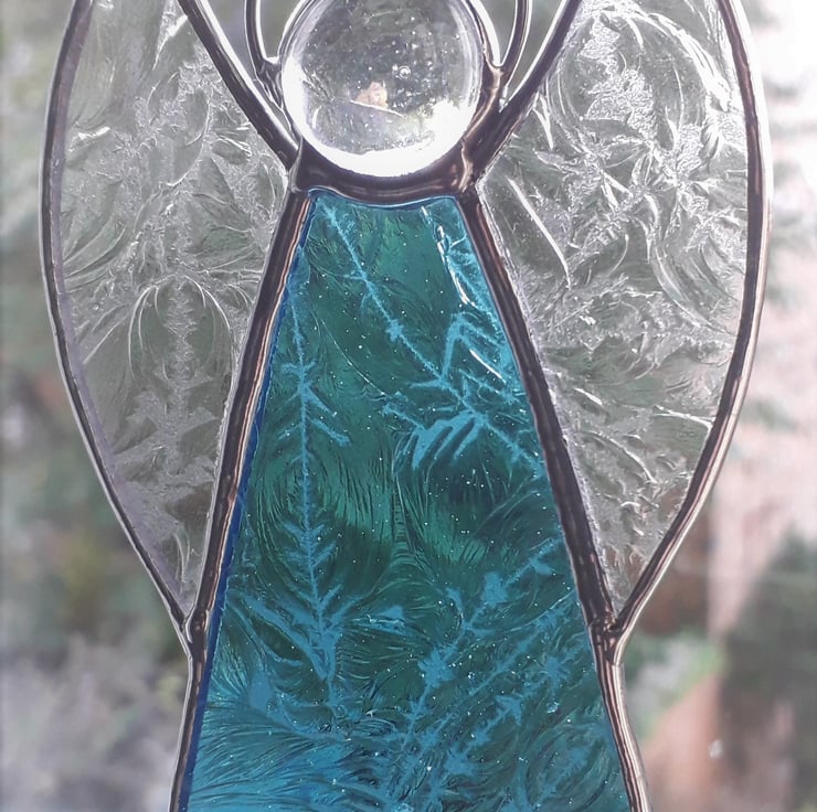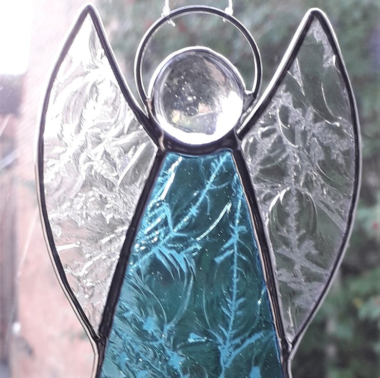 Our stained glass Angel will look great on the Christmas Tree or hanging where it will catch light. It is hand-crafted using the Tiffany method of stained glass making. Each piece of glass is cut by hand and the edges of the glass are wrapped in copper foil which is burnished to the glass. The pieces are soldered together with a fine bead solder line and then topped with a glass globule and a halo. The finished Angel is polished and a hand tied loop is added so that it is ready for you to hang in your chosen place. We have used Aquamarine glue chip glass for the dress and clear glue chip for her wings. The glue chip glass has a beautiful frost-like texture.