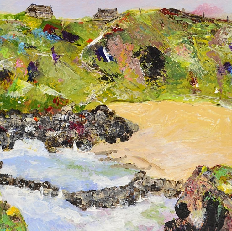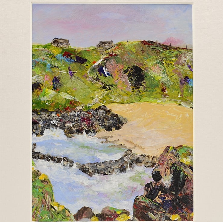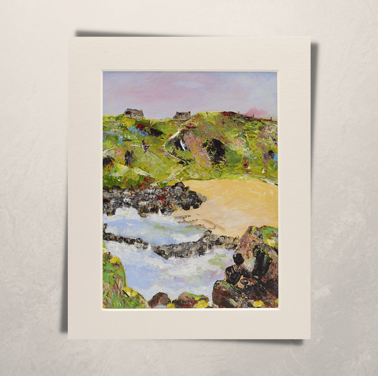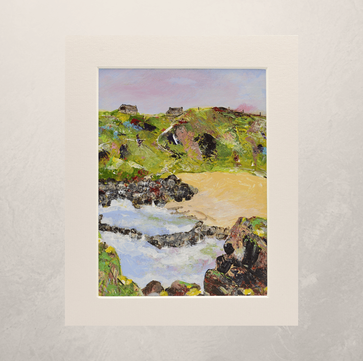 (002) This painting is based on trips to Whinnyfold beach in Aberdeenshire. There are a few houses perched on the tops of the cliffs and the beach itself is a wonderful spot to catch views of wildlife. This would make an ideal gift for any art lover on any occasion.