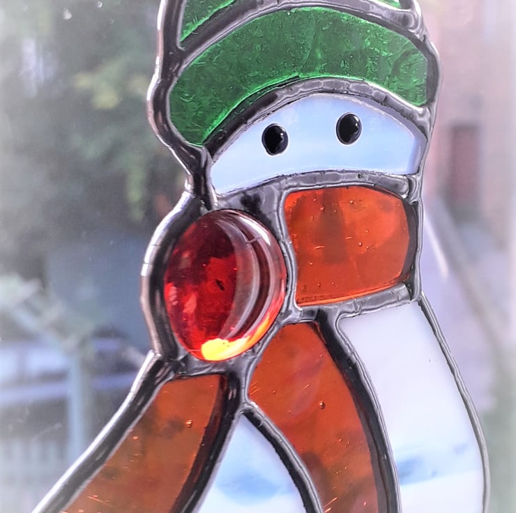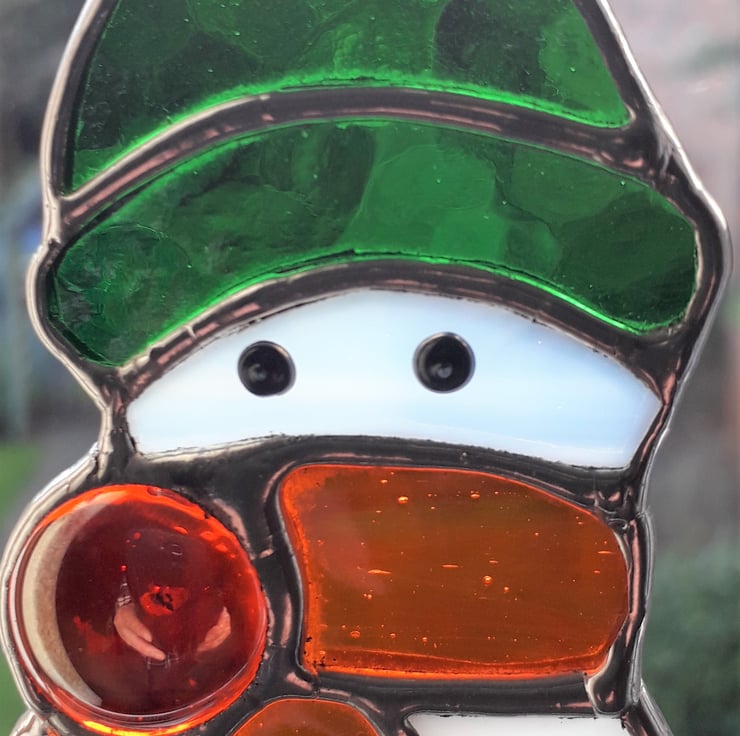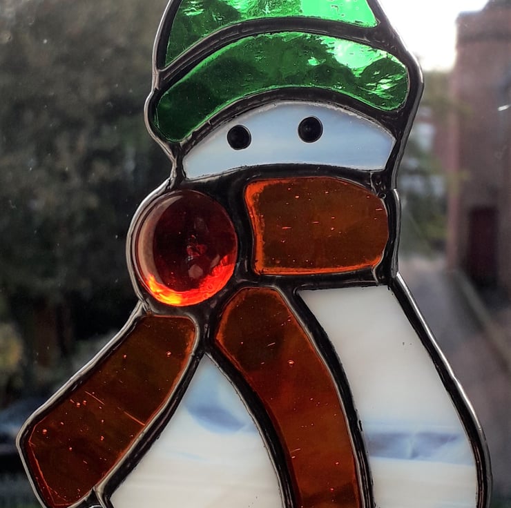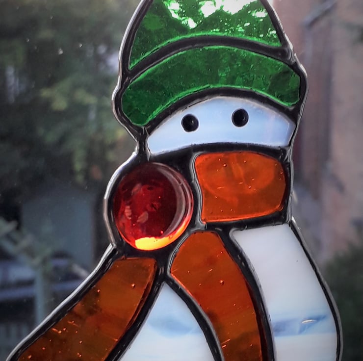 Enjoy our lovely stained glass snowman on your Christmas Tree or display him where he will catch natural light. He is hand-crafted using the traditional Tiffany method of stained glass making. Each piece of glass is cut by hand and shaped using a grinder. The edges of the glass are wrapped in copper foil which is burnished to the glass. The pieces are soldered together with a fine bead solder line. The snowman is made using white wispy glass, his green hat is made from hammered glass and his scarf is cut from orange streaky glass.