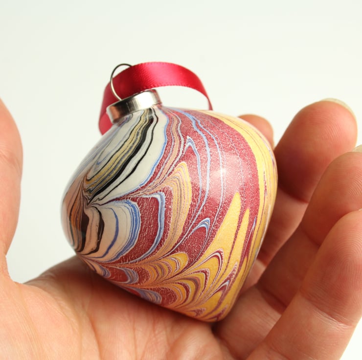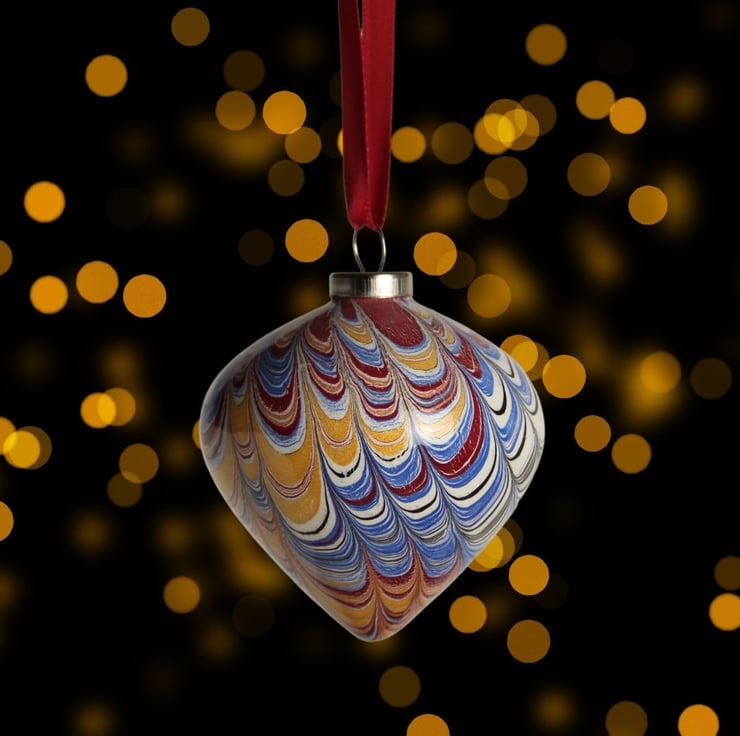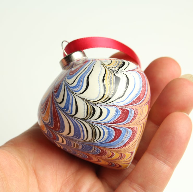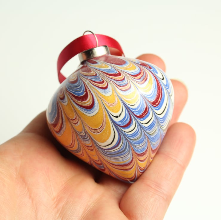 A pretty hand marbled ceramic bauble in a traditional palette of rich gold, deep red, blue, black and cream in a non pareil pattern.