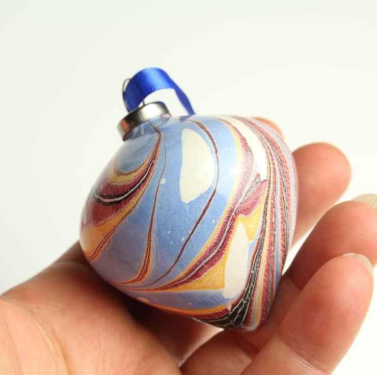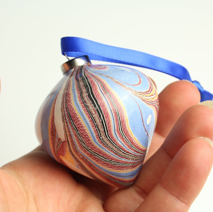 The baubles in this range are marbled directly onto the ceramic surface - a technique which is much more difficult than it sounds! Each bauble is marbled from a different bath, so they are all different and totally unique. They are lots of fun to make and totally addictive!