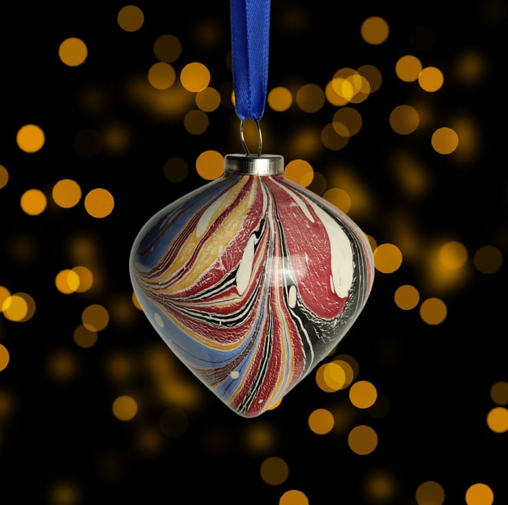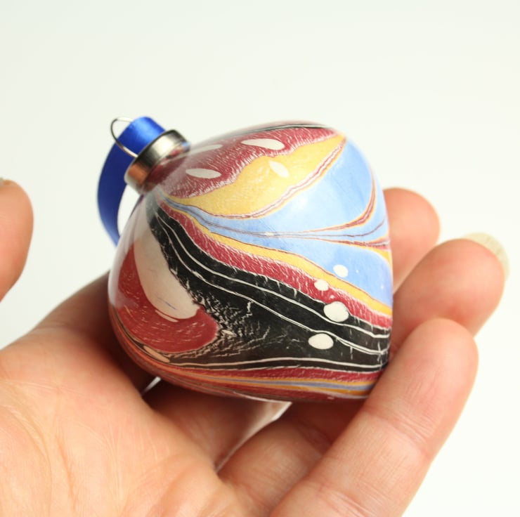 A pretty hand marbled ceramic bauble in a traditional palette of rich gold, deep red, blue, black in a chevron pattern with cream spots on top.
