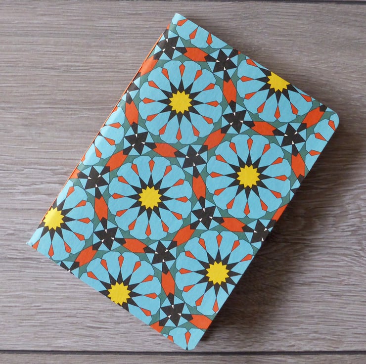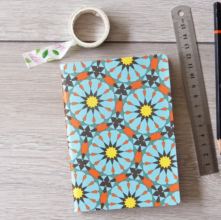 Handmade A6 pocket notebook with blue and orange geometric decorative cover