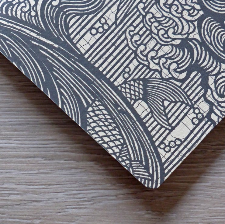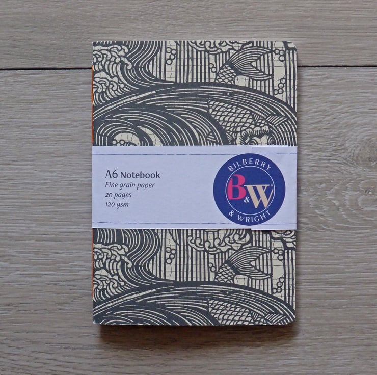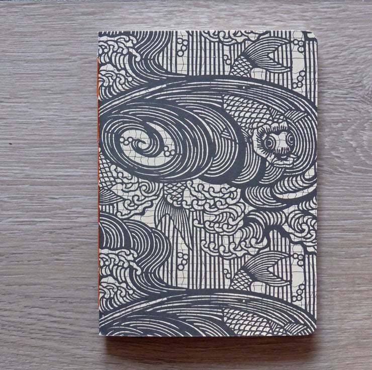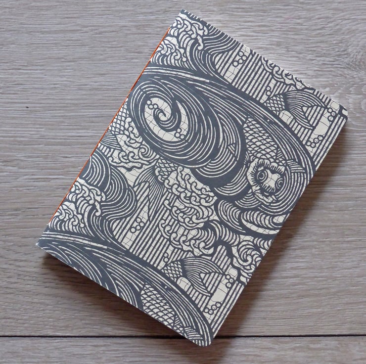 A handmade A6 notebook, with a decorative cover of Japanese Katagami fish pattern in black, made up with fine grain acid-free paper cut to size and stitched together with a traditional handstitched chain stitch linen thread binding.