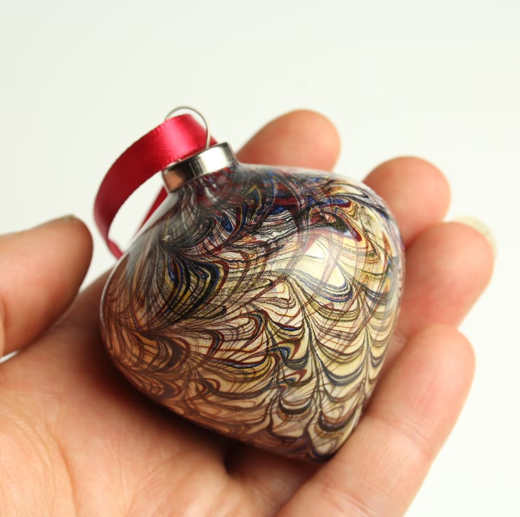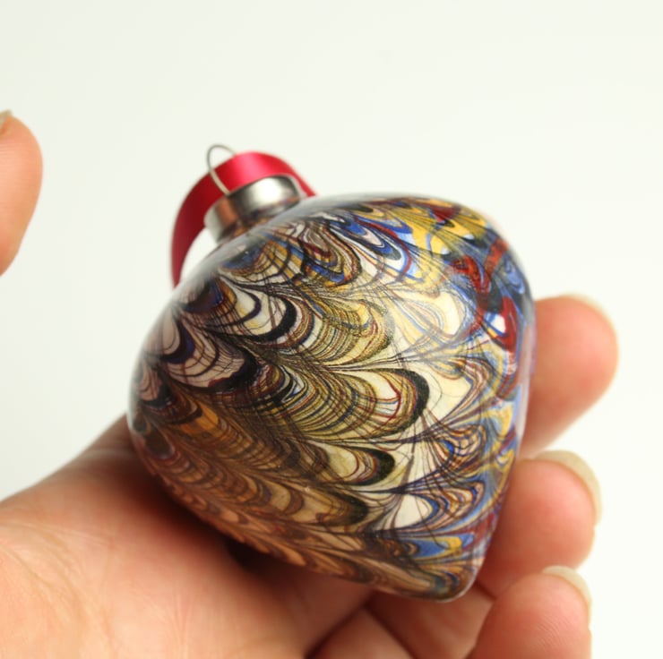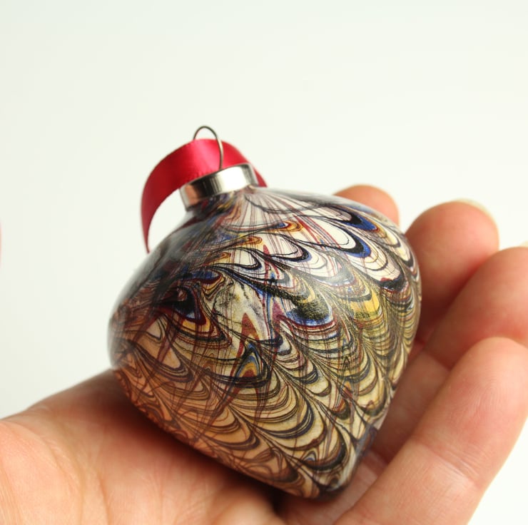 The baubles in this range are marbled directly onto the ceramic surface - a technique which is much more difficult than it sounds! Each bauble is marbled from a different bath, so they are all different and totally unique. They are lots of fun to make and totally addictive!