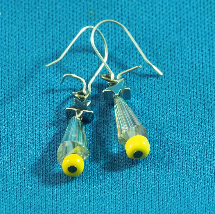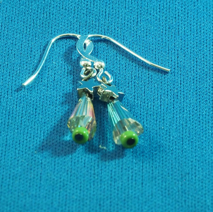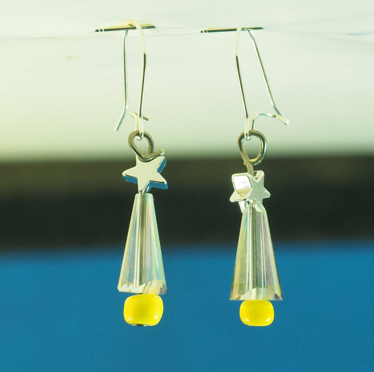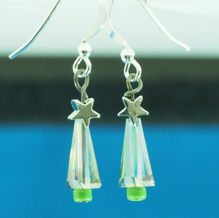 Little Christmas Earrings, made using conical beads with a green tint and a rainbow shimmer, They are on a head pin with a glass bead as the tree's pot and a silver plated star at the top. Hung on Sterling silver ear wires. Measuring about 3cm including the wires.