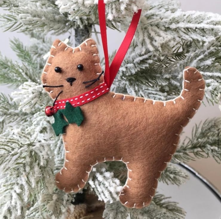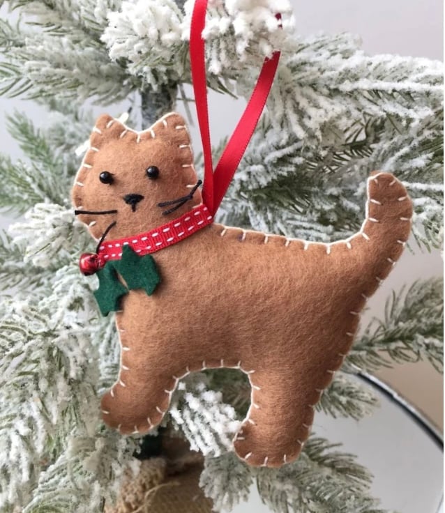 Sweet little cat decoration, hand-sewn in brown felt with bead eyes and whiskers, a smart red collar, little tinkly bell 'berry' and holly leaves.