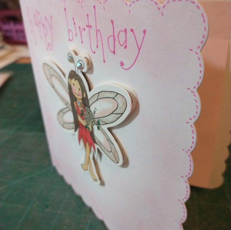 A completely handmade and uniquely designed card. Consisting of a cute fairy which has been hand coloured mounted onto quality pristine white card which has been shaded pink. Happy birthday hand written in pink gel pen. Finished off with silver rhinestones. This can be personalised with the child's name and/or age