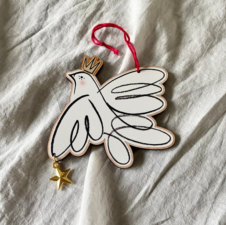 Beautiful Christmas Peace Dove decoration, perfect for displaying in your festive home! These Doves are printed on responsibly sourced Cherry veneer, sustainably made in the UK - they're then hand finished by myself with a shining gold star and cotton cord.